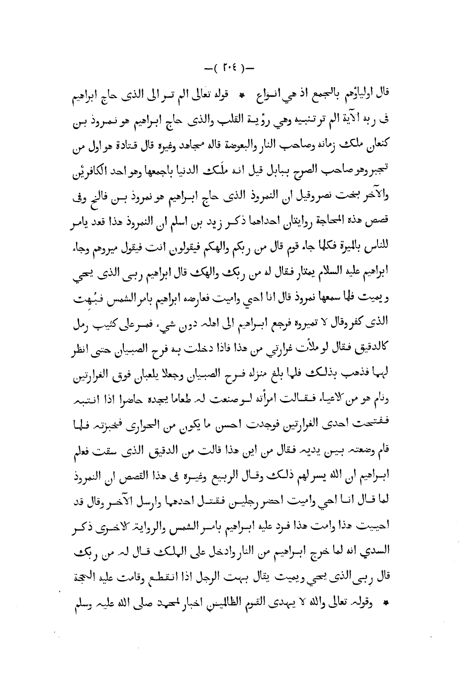 قال أولياؤهم بالجمع إذ هي أنواع قوله تعالى ألم تر إلى الذي حاج إبراهيم في ربه الآية ألم تر تنبيه وهي رؤية القلب والذي حاج إبراهيم هو نمروذ بن كنعان ملك زمانه وصاحب النار والبعوضة قاله مجاهد وغيره قال قتادة هو أول من تجبر وهو صاحب الصرح ببابل قيل أنه ملك الدنيا بأجمعها وهو أحد الكافرين والآخر بخت نصر وقيل أن النمروذ الذي حاج إبراهيم هو نمرود بن فالخ وفي قصص هذه المحاجة روايتان إحداهما ذكر زيد بن أسلم أن النمروذ هذا قعد يأمر للناس بالميرة فكلما جاء قوم قال من ربكم وإلهكم فيقولون أنت فيقول ميروهم وجاء إبراهيم عليه السلام يمتار فقال له من ربك وإلهك قال إبراهيم ربي الذي يحي ويميت فلما سمعها نمروذ قال أنا أحي وأميت فعارضه إبراهيم بأمر الشمس فبهت الذي كفر وقال لا تميروه فرجع إبراهيم إلى أهله دون شيء فمر على كثيب رمل كالدقيق فقال لو ملأت غرارتي من هذا فإذا دخلت به فرح الصبيان حتى أنظر لهما فذهب بذلك فلما بلغ منزله فرح الصبيان وجعلا يلعبان فوق الغرارتين ونام هو من الإعياء فقالت امرأته لو صنعت له طعاما يجده حاضرا إذا انتبه ففتحت إحدى الغرارتين فوجدت أحسن ما يكون من الحوارى فخبرته فلما قام وضعته بين يديه فقال من أين هذا قالت من الدقيق الذي سقت فعلم إبراهيم أن الله يسر لهم ذلك وقال الربيع وغيره في هذا القصص أن النمروذ لما قال أنا أحي وأميت أحضر رجلين فقتل أحدهما وأرسل الآخر وقال قد أحييت هذا وأمت هذا فرد عليه إبراهيم بأمر الشمس والرواية الأخرى ذكر السيد أنه لما خرج إبراهيم من النار وأدخل على الملك قال له من ربك قال ربي الذي يحي ويميت يقال بهت الرجل إذا انقطع وقامت عليه الحجة وقوله تعالى والله لا يهدي القوم الظالمين إخبار لمحمد صلى الله عليه و سلم