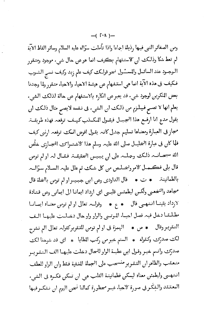 ومن الصغائر التي فيها رذيلة إجماعا وإذا تأملت سؤاله عليه السلام وسائر ألفاظ الآية لم تعط شكا وذلك أن الاستفهام بكيف إنما هو عن حال شيء موجود ومتقرر الوجود عند السائل والمسؤول نحو قولك كيف علم زيد وكيف نسج الثوب فكيف في هذه الآية إنما هي استفهام عن هيئة الإحياء والإحياء متقرر ولما وجدنا بعض المنكرين لوجود شيء قد يعبر عن إنكاره بالاستفهام عن حالة لذلك الشيء يعلم أنها لا تصح فيلزم من ذلك أن الشيء في نفسه لا يصح مثال ذلك أن يقول مدع أنا أرفع هذا الجبل فيقول المكذب كيف ترفعه فهذه طريقة مجاز في العبارة ومعناها تسليم جدلي كأنه يقول أفرض أنك ترفعه ارني كيف فلما كان في عبارة الخليل صلى الله عليه و سلم هذا الاشتراك المجازي خلص الله سبحانه ذلك وحمله علىأن يبين الحقيقة فقال له أولم تؤمن قال بلى فكمل الأمر وتخلص من كل شك ثم علل عليه السلام سؤاله بالطمانينة ت قال الداودي وعن ابن جبير أولم تؤمن بالخلة قال مجاهد والنخعي ولكن ليطمئن قلبي أي ازداد إيمانا إلى إيماني وعن قتادة لأزداد يقينا انتهى قال ع وقوله تعالى أولم تؤمن معناه إيمانا مطلقا دخل فيه فصل إحياء الموتى والواو واو حال دخلت عليها ألف التقرير وقال ص الهمزة في أولم تؤمن للتقرير كقوله تعالى ألم نشرح لك صدرك وكقوله ألستم خير من ركب المطايا أي قد شرحنا لك صدرك وأنتم خير وقول أبن عطية الواو للحال دخلت عليها ألف التقرير متعقب والظاهر أن التقرير منسحب على الجملة المنفية فقط وأن الواو للعطف انتهى وليطمئن معناه ليسكن فطمأنينة القلب هي أن تسكن فكره في الشيء المعتقد والفكر في صورة الإحياء غير محظورة كمالنا نحن اليوم أن نفكر فيها