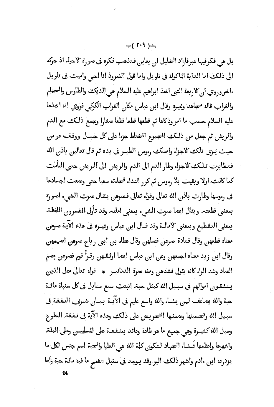 بل هي فكر فيها عبر فأراد الخليل أن يعاين فتذهب فكره في صورة الإحياء إذ حركه إلى ذلك أما الدابة المأكولة في تأويل وأما قول النمروذ أنا أحي وأميت في تأويل آخر وروي أن الأربعة التي أخذ إبراهيم عليه السلام هي الديك والطاوس والحمام والغاب قاله مجاهد وغيره وقال ابن عباس مكان الغراب الكركي فروي أنه أخذها عليه السلام حسب ما أمر وذكاها ثم قطعها قطعا قطعا صغارا وجمع ذلك مع الدم والريش ثم جعل من ذلك المجموع المختلط جزءا على كل جبل ووقف هو من حيث يرى تلك الأجزاء وأمسك رؤوس الطير في يده ثم قال تعالين بإذن الله فتطايرت تلك الأجزاء وطار الدم إلى الدم والريش إلى الريش حتى التأمت كما كانت أولا وبقيت بلا رؤوس ثم كرر النداء فجاءته سعيا حتى وضعت أجسادها في رؤوسها وطارت بإذن الله تعالى وقوله تعالى فصرهن يقال صرت الشيء أصوره بمعنى قطعته يقال أيضا صرت الشيء بمعنى أملته وقد تأول المفسرون اللفظة بمعنى التقطيع وبمعنى الإمالة وقد قال ابن عباس وغيره في هذه الآية صرهن معناه قطعهن وقال قتادة صرهن فصلهن وقال عطاء بن أبي رباح صرهن أضممهن وقال ابن زيد معناه اجمعهن وعن ابن عباس أيضا أوثقهن وقرأ قوم فصرهن بضم الصاد وشد الراء كأنه يقول فشدهن ومنه صرة الدنانير قوله تعالى مثل الذين ينفقون أموالهم في سبيل الله كمثل حبة أنبتت سبع سنابل في كل سنبلة مائة حبة والله يضاعف لمن يشاء والله واسع عليم في الآية بيان شرف النفقة في سبيل الله وتحسينها وضمنها التحريض على ذلك وهذه الآية في نفقة التطوع وسبل الله كثيرة وهي جميع ما هو طاعة وعائد بمنفعة على المسلمين وعلى الملة وأشهرها وأعظمها غناء الجهاد لتكون كلمة الله هي العليا والحبة اسم جنس لكل ما يزدرعه ابن آدم وأشهر ذلك البر وقد يوجد في سنبل القمح ما فيه مائة حبة وأما