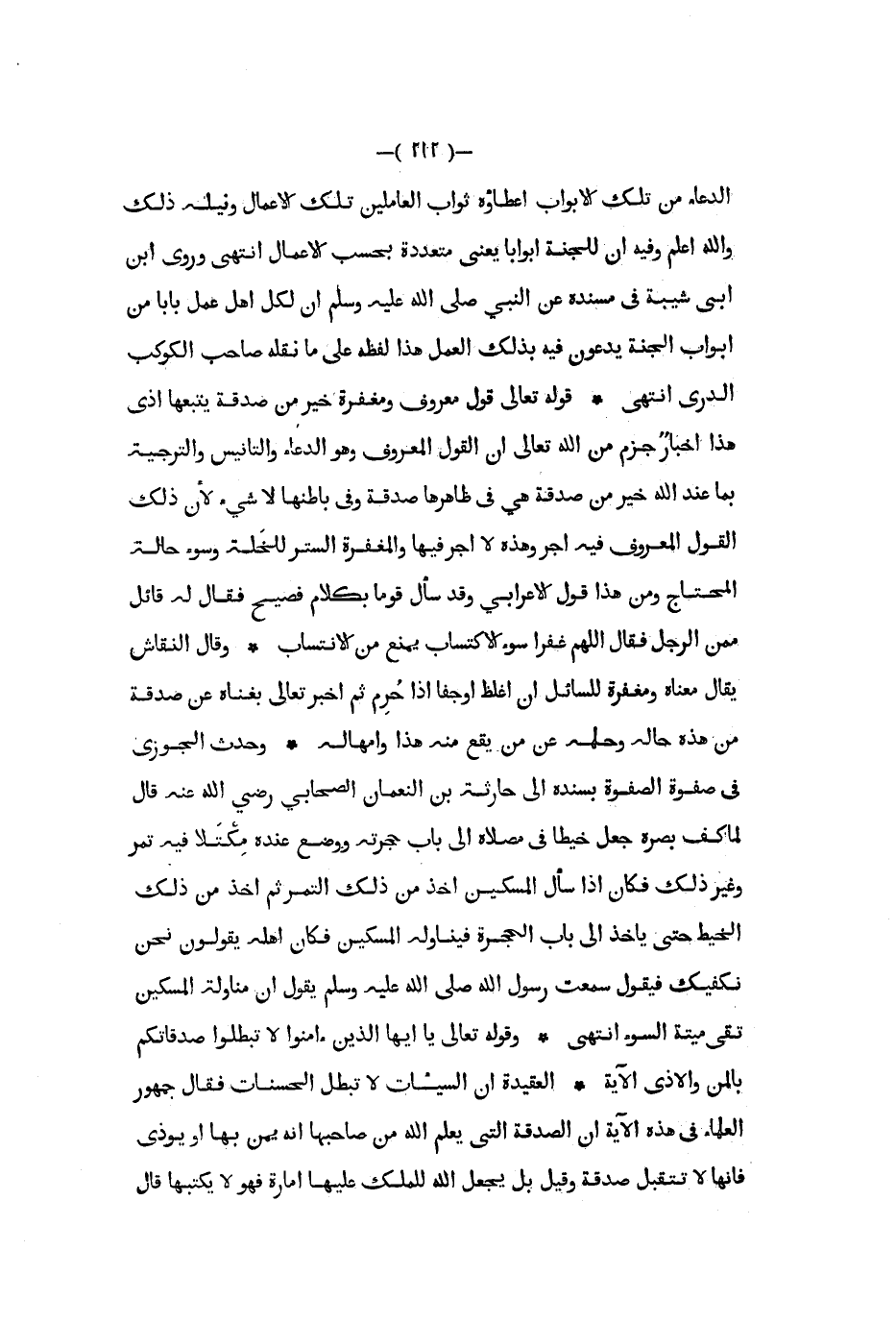 الدعاء من تلك الأبواب اعطاؤه ثواب العاملين تلك الأعمال ونيله ذلك والله اعلم وفيه ان للجنة ابوابا يعنى متعددة بحسب الأعمال انتهى وروى ابن أبي شيبة في مسنده عن النبي صلى الله عليه و سلم أن لكل اهل عمل بابا من أبواب الجنة يدعون فيه بذلك العمل هذا لفظه على ما نقله صاحب الكوكب الدري انتهى قوله تعالى قول معروف ومغفرة خير من صدقة يتبعها أذى هذا أخبار جزم من الله تعالى أن القول المعروف وهو الدعاء والتأنيس والترجية بما عند الله خير من صدقه هي في ظاهرها صدقة وفي باطنها لا شيء لأن ذلك القول المعروف فيه اجر وهذه لا اجر فيها والمغفرة الستر للخلة وسوء حالة المحتاج ومن هذا قول الاعرابي وقد سأل قوما بكلام فصيح فقال له قائل ممن الرجل فقال اللهم غفرا سوء الاكتساب يمنع من الانتساب وقال النقاش يقال معناه ومغفرة للسائل ان اغلظ اوجفا اذا حرم ثم اخبر تعالى بغناه عن صدقة من هذه حاله وحلمه عن من يقع منه هذا وامهاله وحدث الجوزي في صفوة الصفوة بسنده الى حارثة بن النعمان الصحابي رضي الله عنه قال لماكف بصره جعل خيطا في مصلاه إلى باب حجرته ووضع عنده مكتلا فيه تمر وغير ذلك فكان إذا سأل المسكين أخذ من ذلك التمر ثم أخذ من ذلك الخيط حتى يأخذ الى باب الحجرة فيناوله المسكين فكان اهله يقولون نحن نكفيك فيقول سمعت رسول الله صلى عليه وسلم يقول ان مناولة المسكين تقى ميتة السوء انتهى وقوله تعالى يا ايها الذين ءامنوا لا تبطلوا صدقاتكم بالمن والأذى الآية العقيدة ان السيات لا تبطل الحسنات فقال جمهور العلماء في هذه الآية ان الصدقة التي يعلم الله من صاحبها انه يمن بها او يؤذي فانها لا تتقبل صدقة وقيل بل يجعل الله للملك عليها امارة فهو لا يكتبها قال