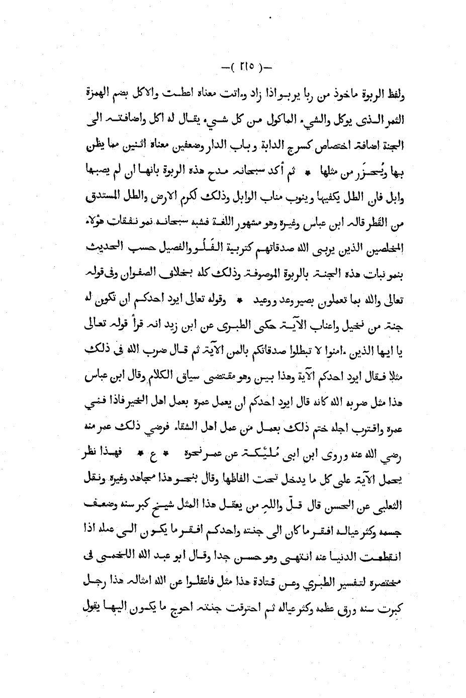 ولفظ الربوة مأخوذ من ربا يربو إذا زاد وءاتت معناه اعطت والأكل بضم الهمزة الثمر الذي يؤكل والشيء المأكول من كل شيء يقال له أكل واضافته الى الجنة اضافة اختصاص كسرج الدابة وباب الدار وضعفين معناه اثنين مما يظن بها ويحزر من مثلها ثم أكد سبحانه مدح هذه الربوة بأنها إن لم يصبها وابل فإن الطل يكفيها وينوب مناب الوابل وذلك لكرم الأرض والطل المستدق من القطر قاله ابن عباس وغيره وهو مشهور اللغة فشبه سبحانه نمو نفقات هؤلاء المخلصين الذين يربى الله صدقاتهم كتربية الفلو والفصيل حسب الحديث بنمو نبات هذه الجنة بالربوة الموصوفة وذلك كله بخلاف الصفوان وفي قوله تعالى والله بما تعملون بصير وعد ووعيد وقوله تعالى ايود احدكم أن تكون له جنة من نخيل واعناب الآية حكى الطبري عن ابن زيد أنه قرأ قوله تعالى يا أيها الذين ءامنوا لا تبطلوا صدقاتكم بالمن الآية ثم قال ضرب الله في ذلك مثلا فقال أيود أحدكم الآية وهذا بين وهو مقتضى سياق الكلام وقال ابن عباس هذا مثل ضربه الله كأنه قال أيود أحدكم أن يعمل عمره بعمل أهل الخير فإذا فني عمره واقترب اجله ختم ذلك بعمل من عمل أهل الشقاء فرضي ذلك عمر منه رضي الله عنه وروى ابن أبي مليكة عن عمر نحوه ع فهذا نظر يحمل الآية على كل ما يدخل تحت الفاظها وقال بنحو هذا مجاهد وغيره ونقل الثعلبي عن الحسن قال قل والله من يعقل هذا المثل شيخ كبر سنه وضعف جسمه وكثر عياله أفقر ما كان إلى جنته واحدكم أفقر ما يكون إلى عمله إذا انقطعت الدنيا عنه انتهى وهو حسن جدا وقال أبو عبد الله اللخمي فى مختصرة لتفسير الطبري وعن قتادة هذا مثل فاعقلوا عن الله أمثاله هذا رجل كبرت سنه ورق عظمه وكثر عياله ثم احترقت جنته احوج ما يكون إليها يقول
