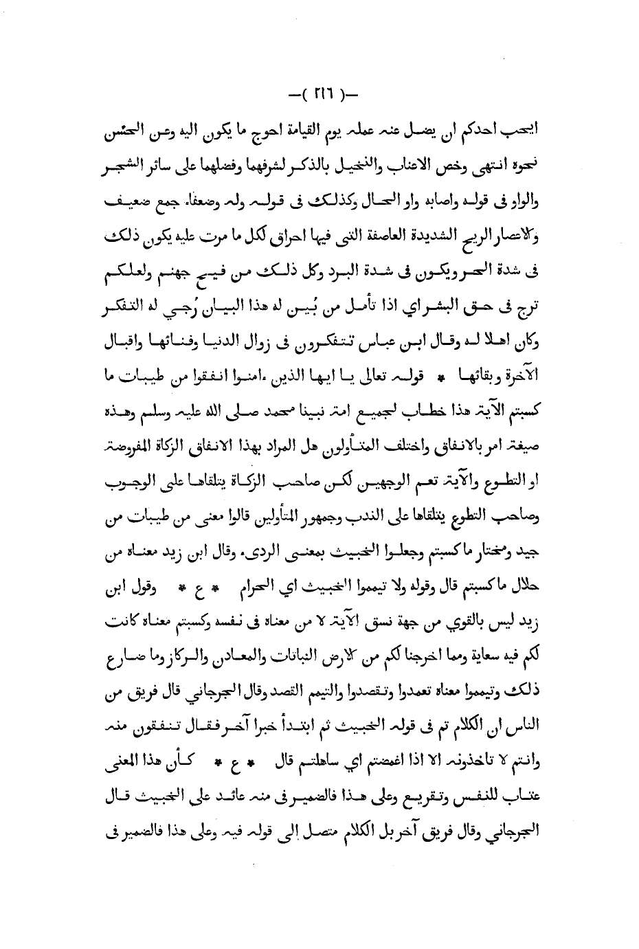 أيحب أحدكم أن يضل عنه عمله يوم القيامة أحوج ما يكون إليه وعن الحسن نحوه انتهى وخص الأعناب والنخيل بالذكر لشرفهما وفضلهما على سائر الشجر والواو في قوله وأصابه واو الحال وكذلك في قوله وله ضعفاء جمع ضعيف والإعصار الريح الشديدة العاصفة التي فيها إحراق لكل ما مرت عليه يكون ذلك في شدة الحر ويكون في شدة البرد وكل ذلك من فيح جهنم ولعلكم ترج في حق البشر أي إذا تأمل من بين له هذا البيان رجي له التفكر وكان أهلا له وقال ابن عباس تتفكرون في زوال الدنيا وفنائها وإقبال الآخرة وبقائها قوله تعالى يا أيها الذين آمنوا أنفقوا من طيبات ما كسبتم الآية هذا خطاب لجميع أمة نبينا محمد صلى الله عليه و سلم وهذه صيغة أمر بالإنفاق واختلف المتأولون هل المراد بهذا الإنفاق الزكاة المفروضة أو التطوع والآية تعم الوجهين لكن صاحب الزكاة يتلقاها على الوجوب وصاحب التطوع يتلقاها على الندب وجمهور المتأولين قالوا معنى من طيبات من جيد ومختار ما كسبتم وجعلوا الخبيث بمعنى الرديء وقال ابن زيد معناه من حلال ما كسبتم قال وقوله ولا تيمموا الخبيث أي الحرام ع وقول ابن زيد ليس بالقوي من جهة نسق الآية لا من معناه في نفسه وكسبتم معناه كانت لكم فيه سعاية ومما أخرجنا لكم من الأرض النباتات والمعادن والركاز وما ضارع ذلك وتيمموا معناه تعمدوا وتقصدوا والتيمم القصد وقال الجرجاني قال فريق من الناس أن الكلام تم في قوله الخبيث ثم ابتدأ خبرا آخر فقال تنفقون منه وأنتم لا تأخذونه إلا إذا اغمضتم أي ساهلتم قال ع كأن هذا المعنى عتاب للنفس تقريع وعلى هذا فالضمير في منه عائد على الخبيث قال الجرجاني وقال فريق آخر بل الكلام متصل إلى قوله فيه وعلى هذا فالضمير في