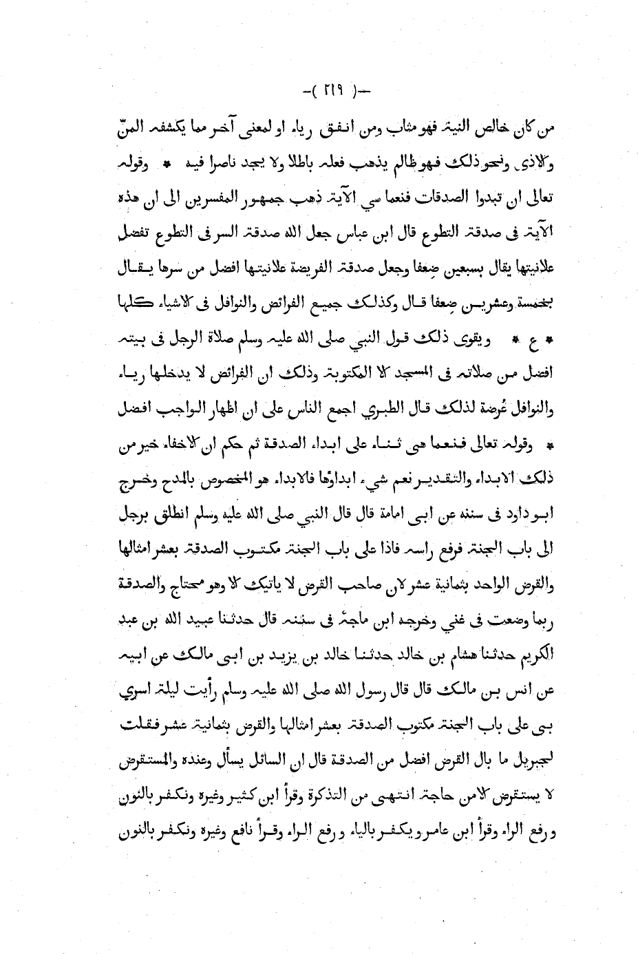 من كان خالص النية فهو مثاب ومن انفق رياء أو لمعنى آخر مما يكشفه المن والأذى ونحو ذلك فهو ظالم يذهب فعله باطلا ولا يجد ناصرا فيه وقوله تعالى إن تبدوا الصدقات فنعما هي الآية ذهب جمهور المفسرين إلى أن هذه الآية في صدقة التطوع قال ابن عباس جعل الله صدقة السر في التطوع تفضل علانيتها يقال بسبعين ضعفا وجعل صدقة الفريضة علانيتها افضل من سرها يقال بخمسة وعشرين ضعفا قال وكذلك جميع الفرائض والنوافل في الأشياء كلها ع ويقوي ذلك قول النبي صلى الله عليه و سلم صلاة الرجل في بيته أفضل من صلاته في المسجد إلا المكتوبة وذلك أن الفرائض لا يدخلها رياء والنوافل عرضة لذلك قال الطبري أجمع الناس على أن إظهار الواجب أفضل وقوله تعالى فنعما هي ثناء على إبداء الصدقة ثم حكم أن الإخفاء خير من ذلك الإبداء والتقرير نعم شيء إبداؤها فالإبداء هو المخصوص بالمدح وخرج أبو داود في سننه عن أبي أمامة قال قال النبي صلى الله عليه و سلم انطلق برجل إلى باب الجنة فرفع رأسه فإذا على باب الجنة مكتوب الصدقة بعشر أمثالها والقرض الواحد بثمانية عشر لأن صاحب القرض لا يأتيك إلا وهو محتاج والصدقة ربما وضعت في غني وخرجه ابن ماجه في سننه قال حدثنا عبيد الله بن عبد الكريم حدثنا هشام بن خالد حدثنا خالد بن يزيد بن أبي مالك عن أبيه عن أنس بن مالك قال قال رسول الله صلى الله عليه و سلم رأيت ليلة أسري بي على باب الجنة مكتوب الصدقة بعشر أمثالها والقرض بثمانية عشر فقلت لجبريل ما بال القرض أفضل من الصدقة قال إن السائل يسأل وعنده والمستقرض لا يستقرض إلا من حاجة انتهى من التذكرة وقرأ ابن كثير وغيره ونكفر بالنون ورفع الراء وقرأ ابن عامر ويكفر بالياء ورفع الراء وقرأ نافع وغيره ونكفر بالنون