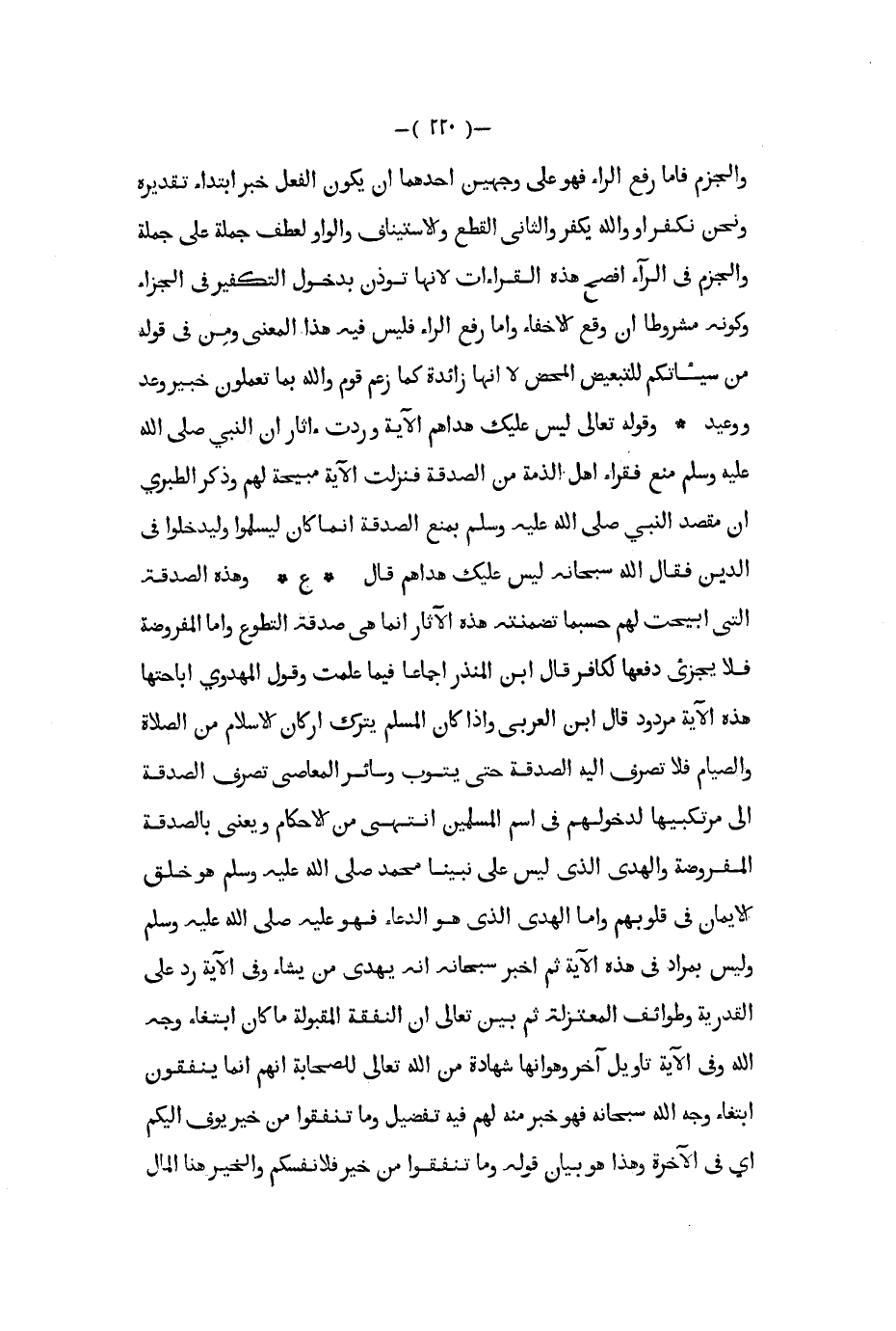 والجزم فأما رفع الراء فهو على وجهين أحدهما أن يكون الفعل خبر ابتداء تقديره ونحن نكفر أو والله يكفر والثاني القطع والاستيناف والواو لعطف جملة على جملة والجزم في الراء أفصح هذه القراءات لأنها تؤذن بدخول التفكير في الجزاء وكونه مشروطا إن وقع الإخفاء وأما رفع الراء فليس فيه هذا المعنى ومن في قوله من سيئاتكم للتبعيض المحض لا أنها زائدة كما زعم قوم والله بما تعلمون خبير وعد ووعيد وقوله تعالى ليس عليك هداهم الآية وردت آثار أن النبي صلى الله عليه و سلم منع فقراء أهل الذمة من الصدقة فنزلت الآية مبيحة لهم وذكر الطبري أن مقصد النبي صلى الله عليه و سلم بمنع الصدقة إنما كان ليسلموا وليدخلوا في الدين فقال الله سبحانه ليس عليك هداهم قال ع وهذه الصدقة التي أبيحت لهم حسبما تضمنته هذه الآثار إنما هي صدقة التطوع وأما المفروضة فلا يجزىء دفعها لكافر قال ابن المنذر اجماعا فيما علمت وقول المهدوي أباحتها هذه الآية مردود قال ابن العربي وإذا كان المسلم يترك أركان الإسلام من الصلاة والصيام فلا تصرف إليه الصدقة حتى يتوب وسائر المعاصي تصرف الصدقة إلى مرتكبيها لدخولهم في اسم المسلمين انتهى من الأحكام ويعني بالصدقة المفروضة والهدى الذي ليس على نبينا محمد صلى اله عليه وسلم هو خلق الايمان فى قلوبهم واما الهدى الذى هو الدعاء فهو عليه ص - وليس بمراد في هذه الآية ثم أخبر سبحانه أنه يهدي من يشاء وفي الآية رد على القدرية وطوائف المعتزلة ثم بين تعالى أن النفقة المقبولة ما كان ابتغاء وجه الله وفي الآية تأويل آخر وهو أنها شهادة من الله تعالى للصحابة أنهم إنما ينفقون ابتغاء وجه الله سبحانه فهو خير منه لهم فيه تفضيل وما تنفقوا من خير يوف إليكم أي في الآخرة وهذا هو بيان قوله وما تنفقوا من خير فلأنفسكم والخير هنا المال