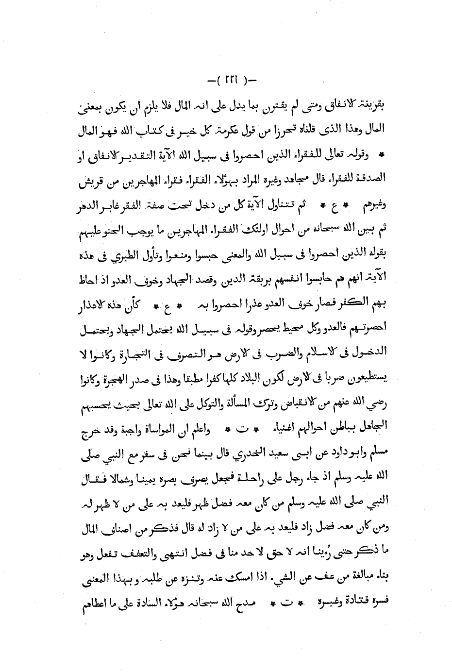 بقرينة الإنفاق ومتى لم يقترن بما يدل على أنه المال فلا يلزم أن يكون بمعنى المال وهذا الذي قلناه تحرزا من قول عكرمة كل خير في كتاب الله فهو المال وقوله تعالى للفقراء الذين احصروا في سبيل الله الآية التقدير الإنفاق أو الصدقة للفقراء قال مجاهد وغيره المراد بهؤلاء الفقراء فقراء المهاجرين من قريش وغيرهم ع ثم تتناول الآية كل من دخل تحت صفة الفقر غابر الدهر ثم بين الله سبحانه من أحوال أولئك الفقراء المهاجرين ما يوجب الحنو عليهم بقوله الذين احصروا في سبيل الله والمعنى حبسوا ومنعوا وتأول الطبري في هذه الآية أنهم هم حابسوا أنفسهم بربقة الدين وقصد الجهاد وخوف العدو إذ أحاط بهم الكفر فصار خوف العدو عذرا احصروا به ع كأن هذه الأعذار أحصرتهم فالعدو وكل محيط يحصر وقوله في سبيل الله يحتمل الجهاد ويحتمل الدخول في الإسلام والضرب في الأرض هو التصرف في التجارة وكانوا لا يستطيعون ضربا في الأرض لكون البلاد كلها كفرا مطبقا وهذا في صدر الهجرة وكانوا رضي الله عنهم من الانقباض وترك المسألة والتوكل على الله تعالى بحيث يحسبهم الجاهل بباطن أحوالهم أغنياء ت واعلم أن المواساة واجبة وقد خرج مسلم وأبو داود عن أبي سعيد الخدري قال بينما نحن في سفر مع النبي صلى الله عليه و سلم إذ جاء رجل على راحلة فجعل يصرف بصره يمينا وشمالا فقال النبي صلى الله عليه و سلم من كان معه فضل ظهر فليعد به على من لا ظهر له ومن كان معه فضل زاد فليعد به على من لا زاد له قال فذكر من أصناف المال ما ذكر حتى رأينا أنه لا حق لأحد منا في فضل انتهى والتعفف تفعل وهو بناء مبالغة من عف عن الشيء إذا أمسك عنه وتنزه عن طلبه وبهذا المعنى فسره قتادة وغيره ت مدح الله سبحانه هؤلاء السادة على ما أعطاهم
