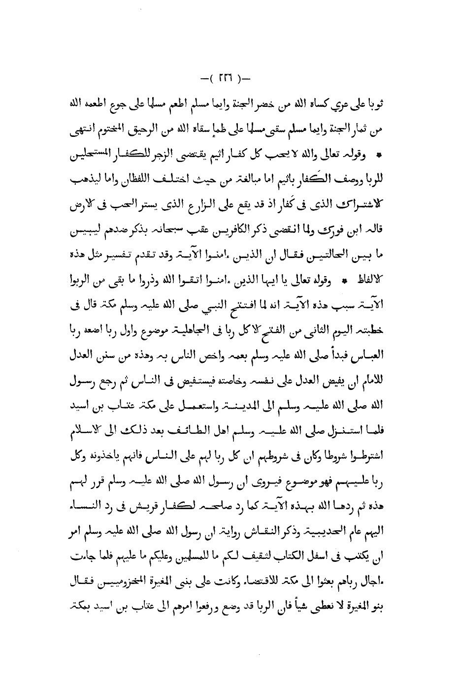 ثوبا على عري كساه الله من حضر الجنة وأيما مسلم أطعم مسلما على جوع أطعمه الله من ثمار الجنة وأيما مسلم سقى مسلما على ظمأ سقاه الله من الرحيق المختوم انتهى وقوله تعالى والله لا يحب كل كفار أثيم يقتضي الزجر للكفار المستحلين للربا ووصف الكفار بأثيم إما مبالغة من حيث اختلف اللفظان وإما ليذهب الاشتراك الذي في كفار إذ قد يقع على الزارع الذي يستر الحب في الأرض قاله ابن فورك ولما انقضى ذكر الكافرين عقب سبحانه بذكر ضدهم ليبين ما بين الحالتين فقال إن الذين آمنوا الآية وقد تقدم تفسير مثل هذه الألفاظ وقوله تعالى يا أيها الذين آمنوا اتقوا الله وذروا ما بقي من الربوا الآية سبب هذه الآية أنه لما افتتح النبي صلى الله عليه و سلم مكة قال في خطبته اليوم الثاني من الفتح الأكل ربا في الجاهلية موضوع وأول ربا أضعه ربا العباس فبدأ صلى الله عليه و سلم بعمه وأخص الناس به وهذه من سنن العدل للإمام أن يفيض العدل على نفسه وخاصته فيستفيض في الناس ثم رجع رسول الله صلى الله عليه و سلم إلى المدينة واستعمل على مكة عتاب بن أسيد فلما استنزل صلى الله عليه و سلم أهل الطائف بعد ذلك إلى الإسلام اشترطوا شروطا وكان في شروطهم أن كل ربا لهم على الناس فإنهم يأخذونه وكل ربا عليهم فهو موضوع فيروى أن رسول الله صلى الله عليه و سلم قرر لهم هذه ثم ردها الله بهذه الآية كما رد صلحه لكفار قريش في رد النساء إليهم عام الحديبية وذكر النقاش رواية أن رسول الله صلى الله عليه و سلم أمر أن يكتب في أسفل الكتاب لثقيف لكم ما للمسلمين وعليكم ما عليهم فلما جاءت آجال رباهم بعثوا إلى مكة للإقتضاء وكانت على بني المغيرة المخزوميين فقال بنو المغيرة لا نعطي شيأ فإن الربا قد وضع ورفعوا أمرهم إلى عتاب بن أسيد بمكة