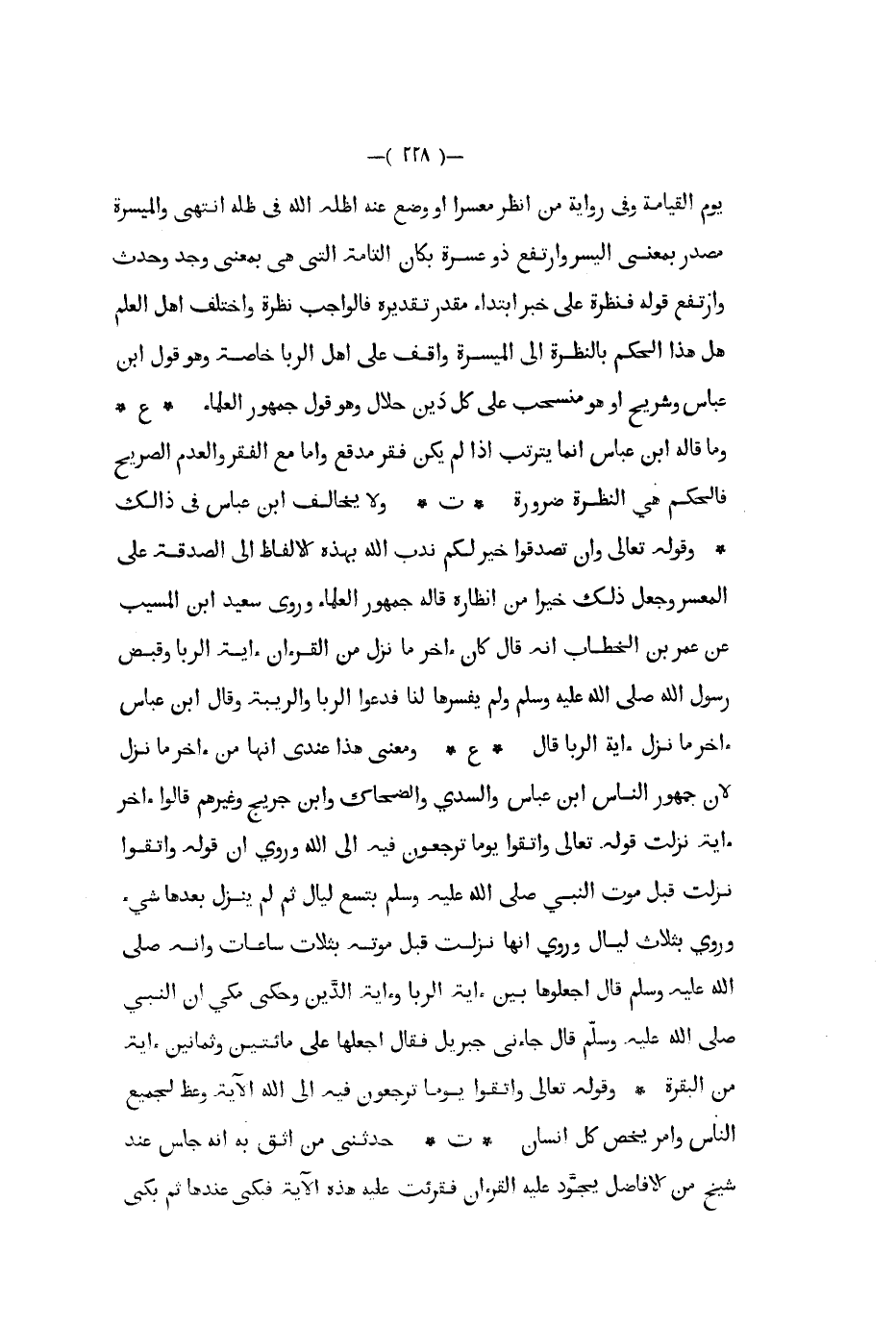 يوم القيامة وفي وراية من أنظر معسرا أو وضع عنه أظله الله في ظله انتهى والميسرة مصدر بمعنى اليسر وارتفع ذو عسرة بكان التامة التي هي بمعنى وجد وحدث وارتفع قوله فنظرة على خبر ابتداء مقدر تقديره فالواجب نظرة واختلف أهل العلم هل هذا الحكم بالنظرة إلى الميسرة واقف على أهل الربا خاصة وهو قول ابن عباس وشريح أو هو منسحب على كل دين حلال وهو قول جمهور العلماء ع وما قاله ابن عباس إنما يترتب إذا لم يكن فقر مدقع وأما مع الفقر والعدم الصريح فالحكم هي النظرة ضرورة ت ولا يخالف ابن عباس في ذالك وقوله تعالى وأن تصدقوا خير لكم ندب الله بهذه الألفاظ إلى الصدقة على المعسر وجعل ذلك خيرا من إنظاره قاله جمهور العلماء وروى سعيد ابن المسيب عن عمر بن الخطاب أنه قال كان آخر ما نزل من القرآن آية الربا وقبض رسول الله صلى الله عليه و سلم ولم يفسرها لنا فدعوا الربا والريبة وقال ابن عباس آخر ما نزل آية الربا قال ع ومعنى هذا عندي أنها من آخر ما نزل لأن جمهور الناس ابن عباس والسدي والضحاك وابن جريج غيرهم قالوا آخر آية نزلت قوله تعالى واتقوا يوما ترجعون فيه إلى الله وروي أن قوله واتقوا نزلت قبل موت النبي صلى الله عليه و سلم بتسع ليال ثم لم ينزل بعدها شيء وروي بثلاث ليال وروي أنها نزلت قبل موته بثلاث ساعات وأنه صلى الله عليه و سلم قال اجعلوها بين آية الربا وأية الدين وحكى مكي أن النبي صلى الله عليه و سلم قال جاءني جبريل فقال اجعلها على مائتين وثمانين آية من البقرة وقوله تعالى واتقوا يوما ترجعون فيه إلى الله الآية وعظ لجميع الناس وأمر يخص كل إنسان ت حدثني من اثق به أنه جلس عند شيخ من الأفاضل يجود عليه القرآن فقرأت عليه هذه الآية فبكى عندها ثم بكى