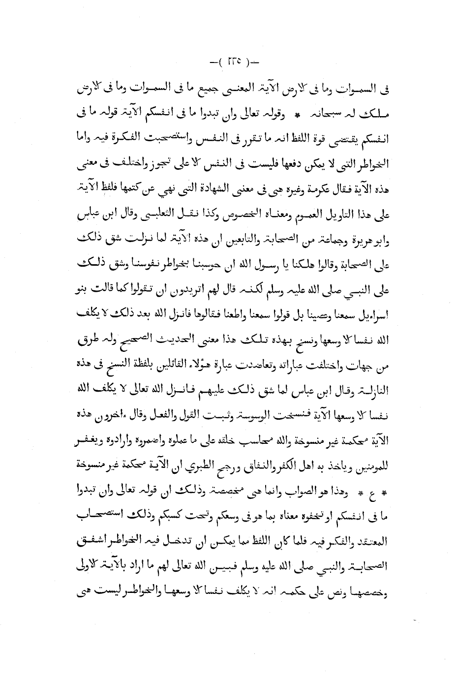 في السموات وما في الأرض الآية المعنى جميع ما في السموات وما في الأرض ملك له سبحانه وقوله تعالى وإن تبدوا ما في أنفسكم الآية قوله ما في أنفسكم يقتضي قوة اللفظ أنه ما تقرر في النفس واستصحبت الفكرة فيه وأما الخواطر التي لا يمكن دفعها فليست في النفس إلا على تجوز واختلف في معنى هذه الآية فقال عكرمة وغيره هي في معنى الشهادة التي نهي عن كتمها فلفظ الآية على هذا التأويل العموم ومعناه الخصوص وكذا نقل الثعلبي وقال ابن عباس وأبو هريرة وجماعة من الصحابة والتابعين أن هذه الآية لما نزلت شق ذلك على الصحابة وقالوا هلكنا يا رسول الله إن حوسبنا بخواطر نفوسنا وشق ذلك على النبي صلى الله عليه و سلم لكنه قال لهم أتريدون أن تقولوا كما قالت بنو إسرائيل سمعنا وعصينا بل قولوا سمعنا وأطعنا فقالوها فأنزل الله بعد ذلك لا يكلف الله نفسا إلا وسعها ونسخ بهذه تلك هذا معنى الحديث الصحيح وله طرق من جهات واختلفت عباراته وتعاضدت عبارة هؤلاء القائلين بلفظة النسخ في هذه النازلة وقال ابن عباس لما شق ذلك عليهم فأنزل الله تعالى لا يكلف الله نفسا إلا وسعها الآية فنسخت الوسوسة وثبت القول والفعل وقال آخرون هذه الآية محكمة غير منسوخة والله محاسب خلقه على ما عملوه واضمروه وأرادوه ويغفر للمؤمنين ويأخذ به أهل الكفر والنفاق ورجح الطبري أن الآية محكمة غير منسوخة ع وهذا هو الصواب وإنما هي مخصصة وذلك أن قوله تعالى وإن تبدوا ما في أنفسكم أو تخفوه معناه بما هو في وسعكم وتحت كسبكم وذلك استصحاب المعتقد والفكر فيه فلما كان اللفظ مما يمكن أن تدخل فيه الخواطر أشفق الصحابة والنبي صلى الله عليه و سلم فبين الله تعالى لهم ما أراد بالآية الأولى وخصصها ونص على حكمه أنه لا يكلف نفسا إلا وسعها والخواطر ليست هي