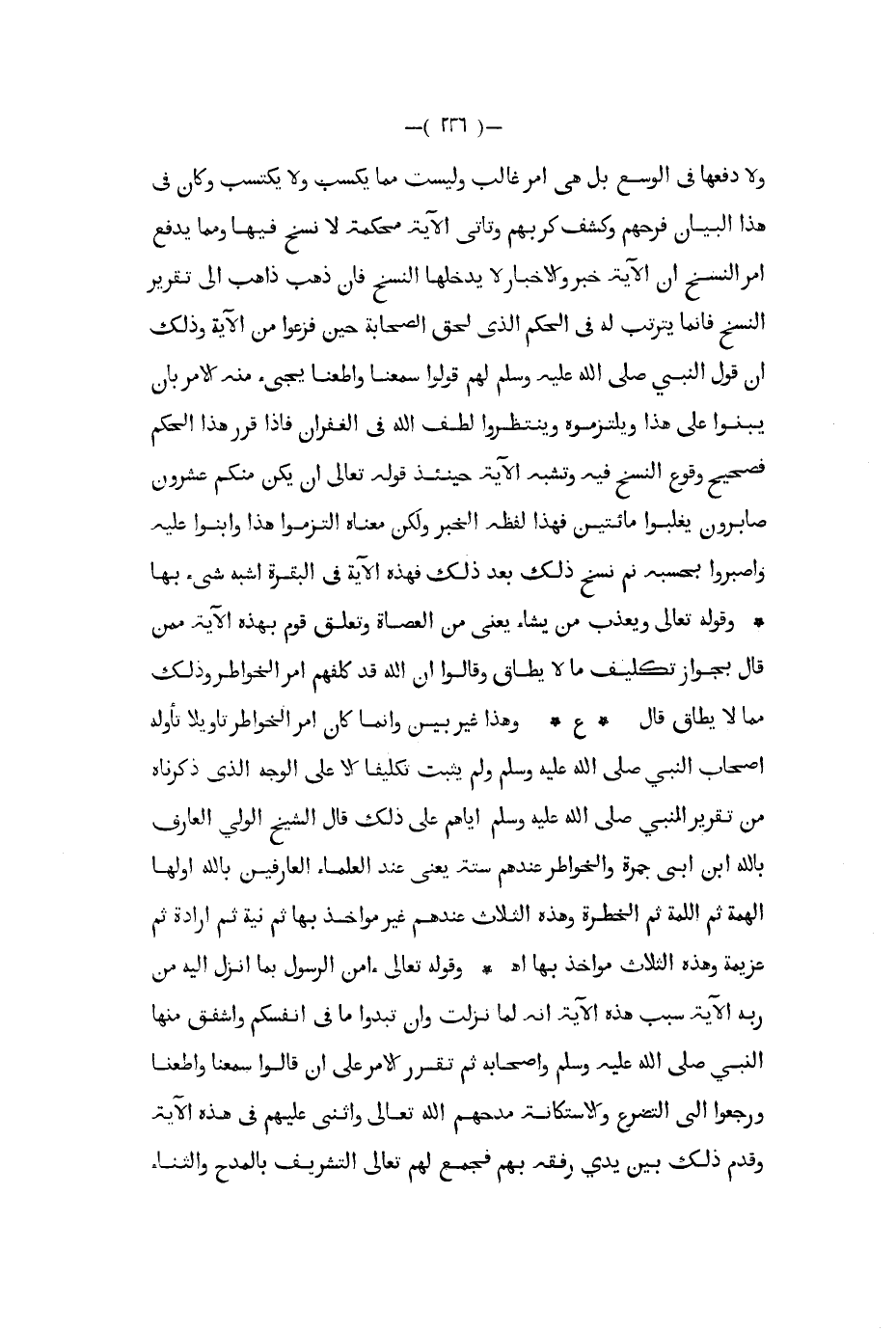 ولا دفعها في الوسع بل هي أمر غالب وليست مما يكسب ولا يكتسب وكان في هذا البيان فرحهم وكشف كربهم وتأتي الآية محكمة لانسخ فيها ومما يدفع أمر النسخ أن الآية خبر والأخبار لا يدخلها النسخ فإن ذهب ذاهب إلى تقرير النسخ فإنما يترتب له في الحكم الذي لحق الصحابة حين فزعوا من الآية وذلك أن قول النبي صلى الله عليه و سلم لهم قولوا سمعنا وأطعنا يجيء منه الأمر بأن يبنوا على هذا ويلتزموه وينتظروا لطف الله في الغفران فإذا قرر هذا الحكم فصحيح وقوع النسخ فيه وتشبه الآية حينئذ قوله تعالى إن يكن منكم عشرون صابرون يغلبوا مائتين فهذا لفظه الخبر ولكن معناه التزموا هذا وابنوا عليه واصبروا بحسبه ثم نسخ ذلك بعد ذلك فهذه الاية في البقرة أشبه شيء بها وقوله تعالى ويعذب من يشاء يعني من العصاة وتعلق قوم بهذه الآية ممن قال بجواز تكليف مالا يطاق وقالوا ان الله قد كلفهم امر الخواطر وذلك مما لا يطاق قال ع وهذا غير بين وإنما كان أمر الخواطر تأويلا تأوله أصحاب النبي صلى الله عليه و سلم ولم يثبت تكليفا إلا على الوجه الذي ذكرناه من تقرير النبي صلى الله عليه و سلم إياهم على ذلك قال الشيخ الولي العارف بالله ابن أبي جمرة والخواطر عندهم ستة يعني عند العلماء العارفين بالله أولها الهمة ثم اللمة ثم الخطرة وهذه الثلاث عندهم غير مؤاخذ بها ثم نية ثم إرادة ثم عزيمة وهذه الثلاث مؤاخذ بها ا ه وقوله تعالى آمن الرسول بما أنزل إليه من ربه الآية سبب هذه الآية أنه لما نزلت وإن تبدوا ما في أنفسكم واشفق منها النبي صلى الله عليه و سلم وأصحابه ثم تقرر الأمر على أن قالوا سمعنا وأطعنا ورجعوا إلى التضرع والاستكانة مدحهم الله تعالى وأثنى عليهم في هذه الآية وقدم ذلك بين يدي رفقه بهم فجمع لهم تعالى التشريف بالمدح والثناء