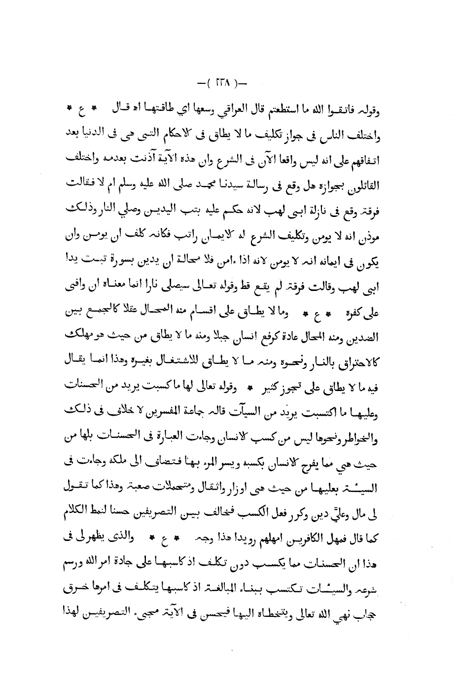 وقوله فاتقوا الله ما استطعتم قال العراقي وسعها أي طاقتها ا ه قال ع واختلف الناس في جواز تكليف ما لا يطاق في الأحكام التي هي في الدنيا بعد اتفاقهم على أنه ليس واقعا الآن في الشرع وأن هذه الآية آذنت بعدمه واختلف القائلون بجوازه هل وقع في رسالة سيدنا محمد صلى الله عليه و سلم أم لا فقالت فرقة وقع في نازلة أبي لهب لأنه حكم عليه بتب اليدين وصلي النار وذلك مؤذن أنه لا يؤمن وتكليف الشرع له الإيمان راتب فكأنه كلف أن يؤمن وأن يكون في إيمانه أنه لا يؤمن لأنه إذا آمن فلا محالة أن يدين بسورة تبت يدا أبي لهب وقالت فرقة لم يقع قط وقوله تعالى سيصلى نارا إنما معناه إن وافى على كفره ع ومالا يطاق على أقسام منه المحال عقلا كالجمع بين الضدين ومنه المحال عادة كرفع إنسان جبلا ومنه ما لا يطاق من حيث هو مهلك كالاحتراق بالنار ونحوه ومنه ما لا يطاق للاشتغال بغيره وهذا إنما يقال فيه ما لا يطاق على تجوز كثير وقوله تعالى لها ما كسبت يريد من الحسنات وعليها ما اكتسبت يريد من السيآت قاله جماعة المفسرين لا خلاف في ذلك والخواطر ونحوها ليس من كسب الإنسان وجاءت العبارة في الحسنات بلها من حيث هي مما يفرح الإنسان بكسبه ويسر المرء بها فتضاف إلى ملكه وجاءت في السيئة بعليها من حيث هي أوزار وأثقال ومتحملات صعبة وهذا كما تقول لي مال وعلي دين وكرر فعل الكسب فخالف بين التصريفين حسنا لنمط الكلام كما قال فمهل الكافرين أمهلهم رويدا هذا وجه ع والذي يظهر لي في هذا أن الحسنات مما يكسب دون تكلف إذ كاسبها على جادة أمر الله ورسم شرعه والسيئات تكتسب ببناء المبالغة إذ كاسبها يتكلف في أمرها خرق حجاب نهي الله تعالى ويتخطاه إليها فيحسن في الآية مجيء التصريفين لهذا