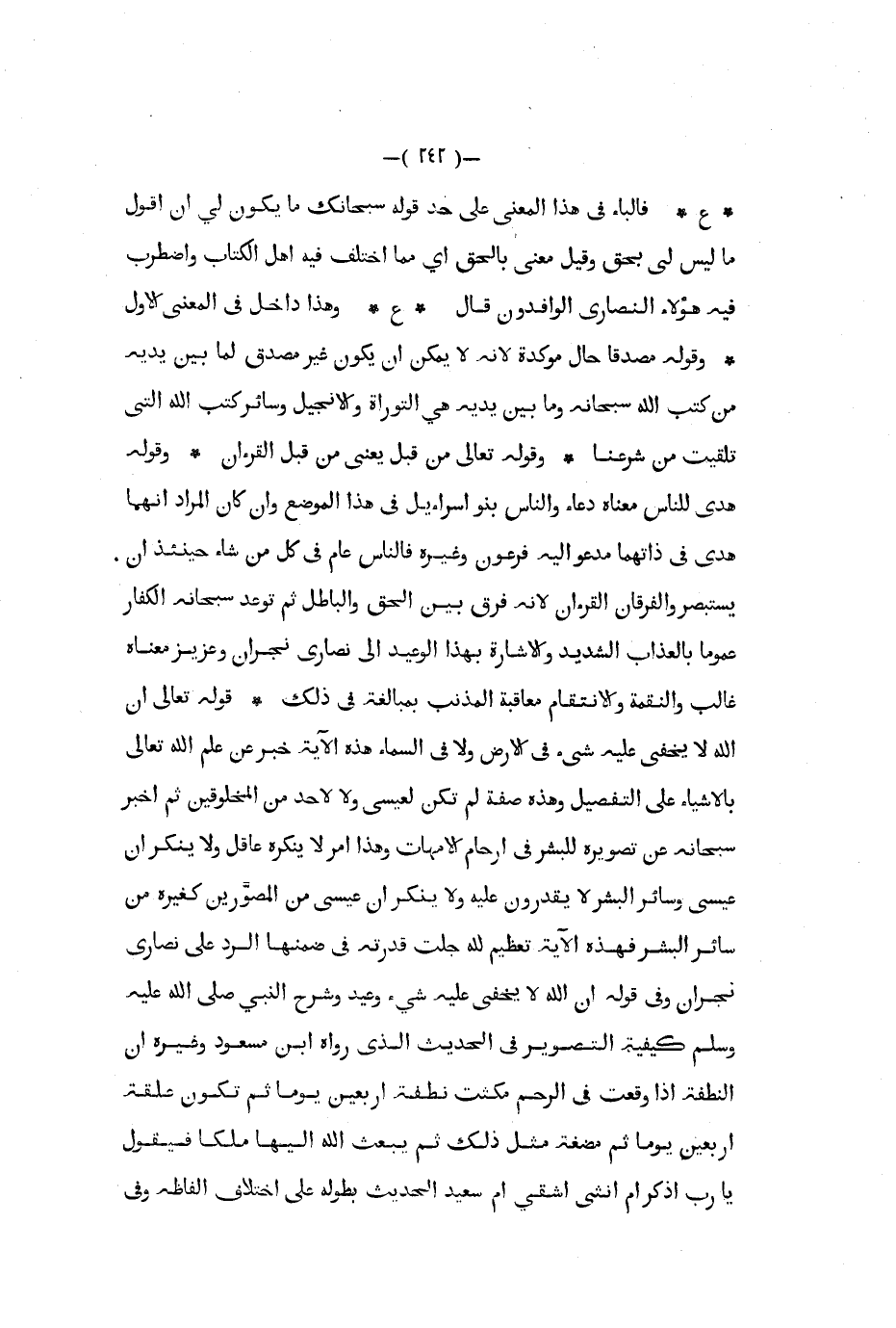 ع فالباء في هذا المعنى على حد قوله سبحانك ما يكون لي أن أقول ما ليس لي بحق وقيل معنى بالحق أي مما اختلف فيه أهل الكتاب واضطرب فيه هؤلاء النصارى الوافدون قال ع وهذا داخل في المعنى الأول وقوله مصدقا حال مؤكدة لأنه لا يمكن أن يكون غير مصدق لما بين يديه من كتب الله سبحانه وما بين يديه هي التوراة والإنجيل وسائر كتب الله التي تلقيت من شرعنا وقوله تعالى من قبل يعني من قبل القرآن وقوله هدى للناس معناه دعاء والناس بنو إسراءيل في هذا الموضع وإن كان المراد أنهما هدى في ذاتهما مدعو إليه فرعون وغيره فالناس عام في كل من شاء حينئذ أن يستبصر والفرقان القرآن لأنه فرق بين الحق والباطل ثم توعد سبحانه الكفار عموما بالعذاب الشديد والإشارة بهذا الوعيد إلى نصارى نجران وعزيز معناه غالب والنقمة والانتقام معاقبة المذنب بمبالغة في ذلك قوله تعالى إن الله لا يخفى عليه شيء في الأرض ولا في السماء هذه الآية خبر عن علم الله تعالى بالأشياء على التفصيل وهذه صفة لم تكن لعيسى ولا لأحد من المخلوقين ثم أخبر سبحانه عن تصويره للبشر في أرحام الأمهات هذا أمر لا ينكره عاقل ولا ينكر أن عيسى وسائر البشر لا يقدرون عليه ولا ينكر ان عيسى من المصورين كغيره من سائر البشر فهذه الآية تعظيم لله جلت قدرته في ضمنها الرد على نصارى نجران وفي قوله أن الله لا يخفى عليه شيء وعيد وشرح النبي صلى الله عليه و سلم كيفية التصوير في الحديث الذي رواه ابن مسعود وغيره أن النطفة إذا وقعت في الرحم مكثت نطفة أربعين يوما ثم تكون علقة أربعين يوما ثم مضغة مثل ذلك ثم يبعث الله إليها ملكا فيقول يا رب أذكر أم أنثى اشقي أم سعيد الحديث بطوله على اختلاف ألفاظه وفي