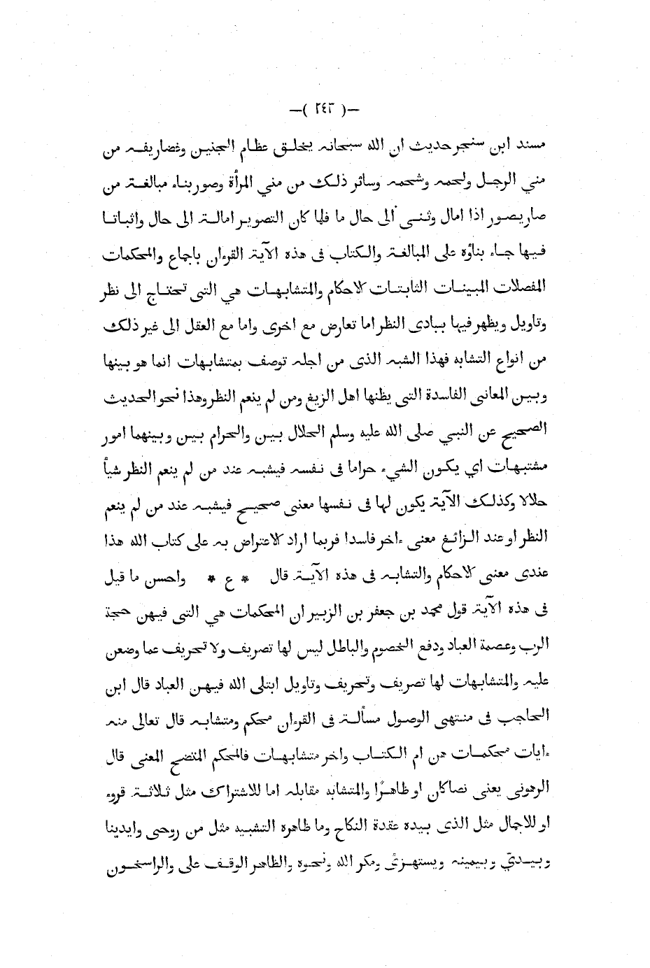 مسند ابن سنجر حديث أن الله سبحانه يخلق عظام الجنين وغضاريفه من مني الرجل ولحمه وشحمه وسائر ذلك من مني المرأة وصور بناء مبالغة من صار يصور إذا أمال وثنى إلى حال ما فلما كان التصوير إمالة إلى حال وإثباتا فيها جاء بناؤه على المبالغة والكتاب في هذه لآية القرآن بإجماع والمحكمات المفصلات المبينات الثابتات الأحكام والمتشابهات هي التي تحتاج إلى نظر وتأويل ويظهر فيها ببادى النظر إما تعارض مع أخرى وإما مع العقل إلى غير ذلك من أنواع التشابه فهذا الشبه الذي من أجله توصف بمتشابهات إنما هو بينها وبين المعاني الفاسدة التي يظنها اهل الزيغ ومن لم ينعم النظر وهذا نحو الحديث الصحيح عن النبي صلى الله عليه و سلم الحلال بين والحرام بين وبينهما أمور متشابهات أي يكون الشيء حراما في نفسه فيشبه عند من لم ينعم النظر شيئا حلالا وكذلك الآية يكون لها في نفسها معنى صحيح فيشبه عند من لم ينعم النظر أو عند الزائغ معنى آخر فاسدا فربما أراد الإعتراض به على كتاب الله هذا عندي معنى الإحكام والتشابه في هذه الآية قال ع وأحسن ما قيل في هذه الآية قول محمد بن جعفر بن الزبير أن المحكمات هي التي فيهن حجة الرب وعصمة العباد ودفع الخصوم والباطل ليس لها تصريف ولا تحريف عما وضعن عليه والمتشابهات لها تصريف وتحريف وتأويل ابتلى الله فيهن العباد قال ابن الحاجب في منتهى الوصول مسألة في القرآن محكم ومتشابه قال تعالى منه آيات محكمات هن أم الكتاب وأخر متشابهات فالمحكم المتضح المعنى قال الرهوني يعني نصا كان أو ظاهرا والمتشابه مقابلة إما للاشتراك مثل ثلاثة قروء أو للإجمال مثل الذي بيده عقدة النكاح وما ظاهره التشبيه مثل من روحي وأيدينا وبيدي وبيمينه ويستهزىء ومكر الله ونحوه والظاهر الوقف على والراسخون