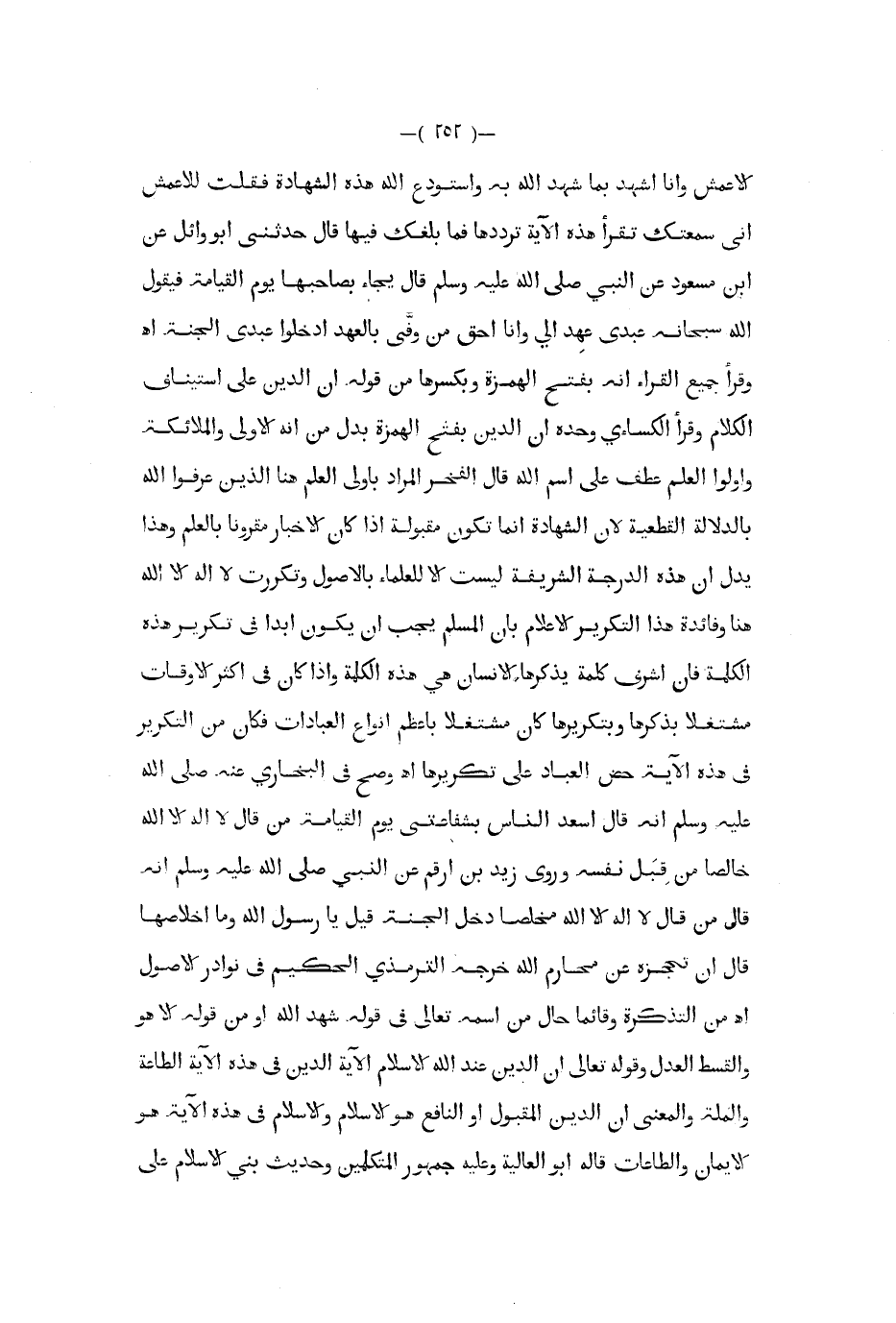 الأعمش وأنا أشهد بما شهد الله به واستودع الله هذه الشهادة فقلت للأعمش أني سمعتك تقرأ هذه الآية ترددها فما بلغك فيها قال حدثني أبو وائل عن ابن مسعود عن النبي صلى الله عليه و سلم قال يجاء بصاحبها يوم القيامة فيقول الله سبحانه عبدي عهد إلي وأنا أحق من وفى بالعهد أدخلوا عبدي الجنة ا ه وقرأ جميع القراء أنه بفتح الهمزة وبكسرها من قوله إن الدين على استيناف الكلام وقرأ الكساءي وحده أن الدين بفتح الهمزة بدل من أنه الأولى والملائكة وأولوا العلم عطف على اسم الله قال الفخر المراد بأولي العلم هنا الذين عرفوا الله بالدلالة القطعية لأن الشهادة إنما تكون مقبولة إذا كان الإخبار مقرونا بالعلم وهذا يدل أن هذه الدرجة الشريفة ليست إلا للعلماء بالأصول وتكررت لا اله إلا الله هنا وفائدة هذا التكرير الإعلام بأن المسلم يجب أن يكون أبدا في تكرير هذه الكلمة فإن أشرف كلمة يذكرها الإنسان هي هذه الكلمة وإذا كان في أكثر الأوقات مشتغلا بذكرها وبتكريرها كان مشتغلا بأعظم أنواع العبادات فكان من التكرير في هذه الآية حض العباد على تكريرها ا ه وصح في البخاري عنه صلى الله عليه و سلم أنه قال اسعد الناس بشفاعتي يوم القيامة من قال لا اله إلا الله خالصا من قبل نفسه وروى زيد بن أرقم عن النبي صلى الله عليه و سلم أنه قال من قال لا اله إلا الله مخلصا دخل الجنة قيل يا رسول الله وما إخلاصها قال أن تحجزه عن محارم الله خرجه الترمذي الحكيم في نوادر الأصول ا ه من التذكرة وقائما حال من اسمه تعالى في قوله شهد الله أو من قوله إلا هو القسط العدل وقوله تعالى إن الدين عند الله الإسلام الآية الدين في هذه الآية الطاعة والملة والمعنى أن الدين المقبول او النافع هو الإسلام والإسلام في هذه الآية هو الإيمان والطاعات قاله أبو العالية وعليه جمهور المتكلمين وحديث بني الإسلام على