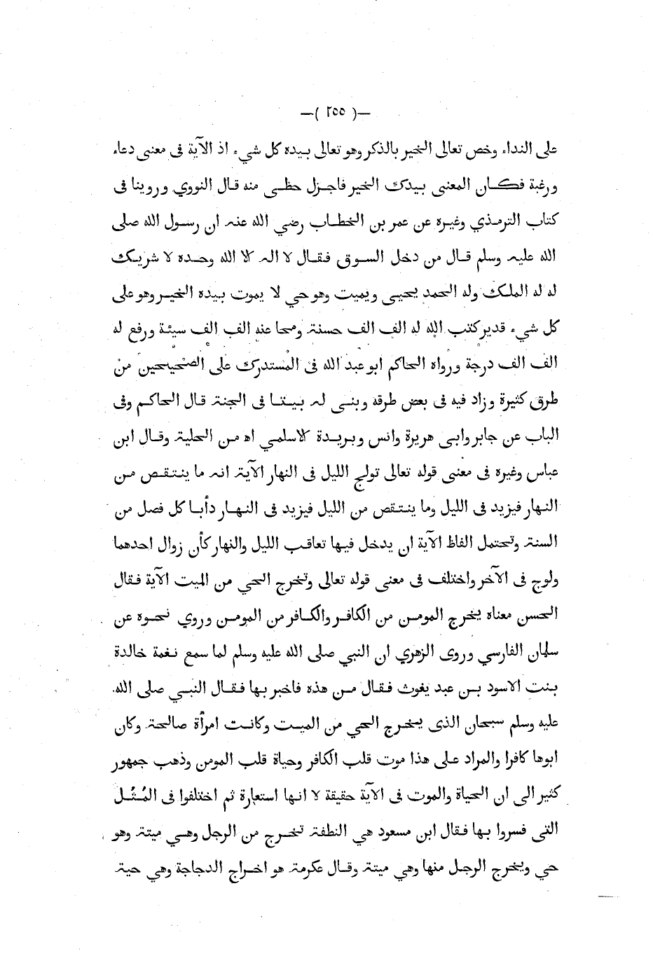 على النداء وخص تعالى الخير بالذكر وهو تعالى بيده كل شيء إذ الآية في معنى دعاء ورغبة فكان المعنى بيدك الخير فاجزل حظي منه قال النووي وروينا في كتاب الترمذي وغيره عن عمر بن الخطاب رضي الله عنه أن رسول الله صلى الله عليه و سلم قال من دخل السوق فقال لا إله إلا الله وحده لا شريك له له الملك وله الحمد يحي ويميت وهو حي لا يموت بيده الخير وهو على كل شيء قدير كتب الله له ألف ألف حسنة ومحا عنه ألف ألف سيئة ورفع له ألف ألف درجة ورواه الحاكم أبو عبد الله في المستدرك على الصحيحين من طرق كثيرة وزاد في بعض طرقه وبنى له بيتا في الجنة قال الحاكم وفي الباب عن جابر وأبي هريرة وأنس وبريدة الأسلمي أ ه من الحلية وقال ابن عباس وغيره في معنى قوله تعالى تولج الليل في النهار الآية أنه ما ينتقص من النهار فيزيد في الليل وما ينتقص من الليل فيزيد في النهار دأبا كل فصل من السنة وتحتمل ألفاظ الآية أن يدخل فيها تعاقب الليل والنهار كأن زوال أحدهما ولوج في الآخر واختلف في معنى قوله تعالى وتخرج الحي من الميت الآية فقال الحسن معناه يخرج المؤمن من الكافر والكافر من المؤمن وروي نحوه عن سلمان الفارسي وروى الزهري أن النبي صلى الله عليه و سلم لما سمع نغمة خالدة بنت الأسود بن عبد يغوث فقال من هذه فأخبر بها فقال النبي صلى الله عليه و سلم سبحان الذي يخرج الحي من الميت وكانت امرأة صالحة وكان أبوها كافرا والمراد على هذا موت قلب الكافر وحياة قلب المؤمن وذهب جمهور كثير إلى أن الحياة والموت في الآية حقيقة لا أنها استعارة ثم اختلفوا في المثل التي فسروا بها فقال ابن مسعود هي النطفة تخرج من الرجل وهي ميتة وهو حي ويخرج الرجل منها وهي ميتة وقال عكرمة هو إخراج الدجاجة وهي حية