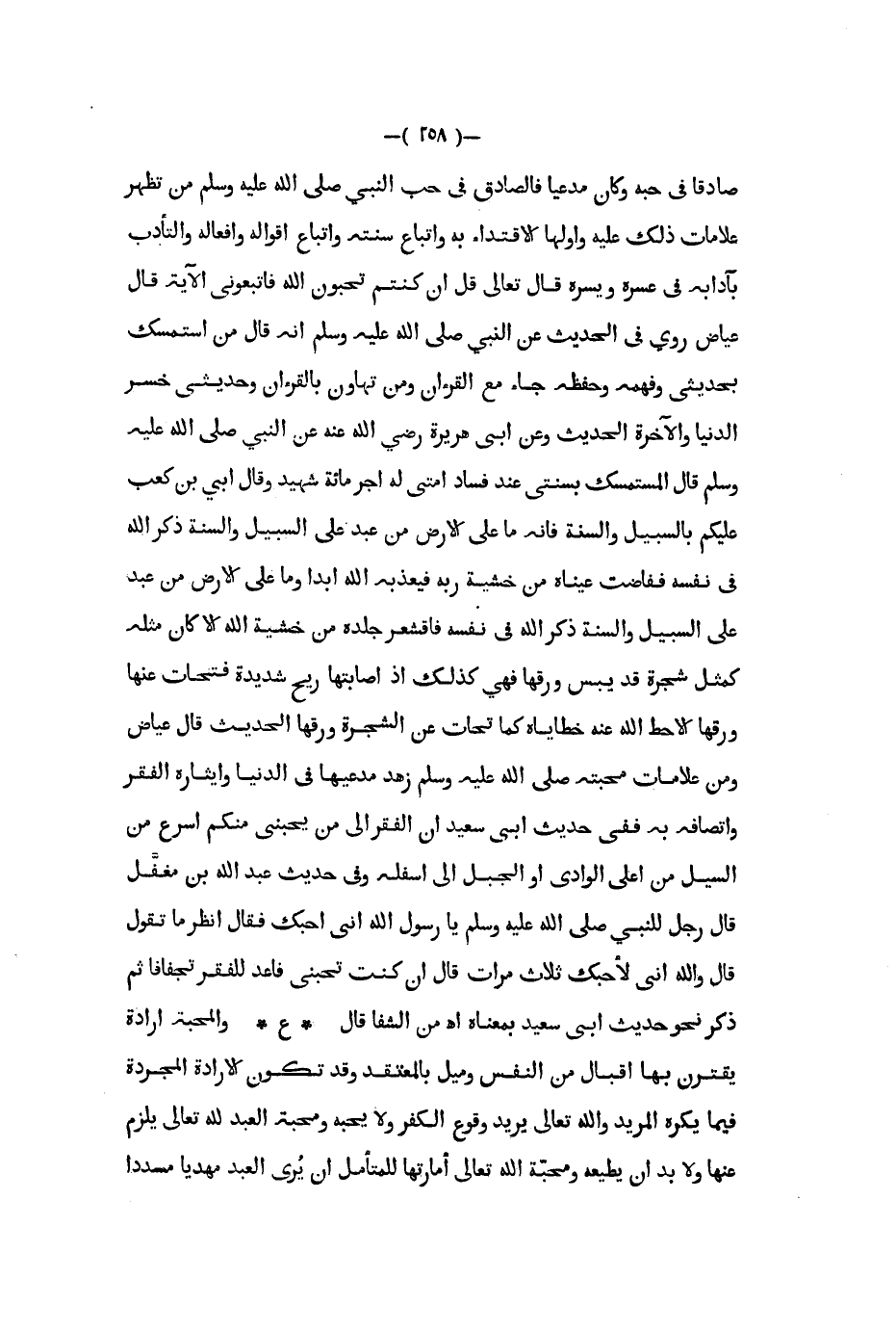 صادقا في حبه وكان مدعيا فالصادق في حب النبي صلى الله عليه و سلم من تظهر علامات ذلك عليه وأولها الاقتداء به واتباع سنته واتباع أقواله وأفعاله والتأدب بآدابه في عسره ويسره قال تعالى قل إن كنتم تحبون الله فاتبعوني الآية قال عياض روي في الحديث عن النبي صلى الله عليه و سلم أنه قال من استمسك بحديثي وفهمه وحفظه جاء مع القرآن ومن تهاون بالقرآن وحديثي خسر الدنيا والآخرة الحديث وعن أبي هريرة رضي الله عنه عن النبي صلى الله عليه و سلم قال المستمسك بسنتي عند فساد أمتي له أجر مائة شهيد وقال أبي بن كعب عليكم بالسبيل والسنة فإنه ما على الأرض من عبد على السبيل والسنة ذكر الله في نفسه ففاضت عيناه من خشية ربه فيعذبه الله ابدا وما على الأرض من عبد على السبيل والسنة ذكر الله في نفسه فاقشعر جلده من خشية الله إلا كان مثله كمثل شجرة قد يبس ورقها فهي كذلك إذ أصابتها ريح شديدة فتحات عنها ورقها إلا حط الله عنه خطاياه كما تحات عن الشجرة ورقها الحديث قال عياض ومن علامات محبته صلى الله عليه و سلم زهد مدعيها في الدنيا وإيثاره الفقر واتصافه به ففي حديث ابي سعيد أن الفقر إلى من يحبني منكم أسرع من السيل من أعلى الوادي أو الجبل إلى أسفله وفي حديث عبد الله بن مغفل قال رجل للنبي صلى الله عليه و سلم يا رسول الله إني أحبك فقال أنظر ما تقول قال والله إني لأحبك ثلاث مرات قال إن كنت تحبني فاعد للفقر تجفافا ثم ذكر نحو حديث ابي سعيد بمعناه أ ه من الشفا قال ع والمحبة إرادة يقترن بها إقبال من النفس وميل بالمعتقد وقد تكون الإرادة المجردة فيما يكره المريد والله تعالى يريد وقوع الكفر ولا يحبه ومحبة العبد لله تعالى يلزم عنها ولا بد أن يطيعه ومحبة الله تعالى أمارتها للمتأمل أن يرى العبد مهديا مسددا