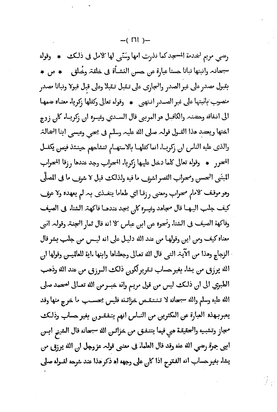 رضي مريم لخدمة المسجد كما نذرت أمها وسنى لها الأمل في ذلك وقوله سبحانه وأنبتها نباتا حسنا عبارة عن حسن النشأة في خلقة وخلق ص بقبول مصدر على غير الصدر والجاري على تقبل تقبلا وعلى قبل قبولا ونباتا مصدر منصوب بأنبتها على غير الصدر انتهى وقوله تعالى وكفلها زكريا معناه ضمها الى انفاقه وحضنه والكافل هو المربى قال السدي وغيره ان زكريا كان زوج أختها ويعضد هذا القول قوله صلى الله لعيه وسلم في يحيى وعيسى ابنا الخالة والذي عليه الناس أن زكريا إنما كفلها بالاستهام لتشاحهم حينئذ فيمن يكفل المحرر وقوله تعالى كلما دخل عليها زكريا المحراب وجد عندها رزقا المحراب المبنى الحسن ومحراب القصر أشرف ما فيه ولذلك قيل لأشرف ما في المصلى وهو موقف الإمام محراب ومعنى رزقا أي طعاما يتغذى به لم يعهده ولا عرف كيف جلب إليها قال مجاهد وغيره كان يجد عندها فاكهة الشتاء في الصيف وفاكهة الصيف في الشتاء ونحوه عن ابن عباس إلا انه قال ثمار الجنة وقوله أنى معناه كيف ومن أين وقولها من عند الله دليل على أنه ليس من جلب بشر قال الزجاج وهذا من الآية التي قال الله تعالى وجعلناها وابنها آية للعالمين وقولها إن الله يرزق من يشاء بغير حساب تقرير لكون ذلك الرزق من عند الله وذهب الطبري إلى أن ذلك ليس من قول مريم وإنه خبر من الله تعالى لمحمد صلى الله عليه و سلم والله سبحانه لا تنتقص خزائنه فليس يحسب ماخرج منها وقد يعبر بهذه العبارة عن المكثرين من الناس أنهم ينفقون بغير حساب وذلك مجاز وتشبيه والحقيقة هي فيما ينتفق من خزائن الله سبحانه قال الشيخ ابن أبي جمرة رضي الله عنه وقد قال العلماء في معنى قوله عز و جل إن الله يرزق من يشاء بغير حساب أنه الفتوح إذا كان على وجهه أ ه ذكر هذا عند شرحه لقوله صلى