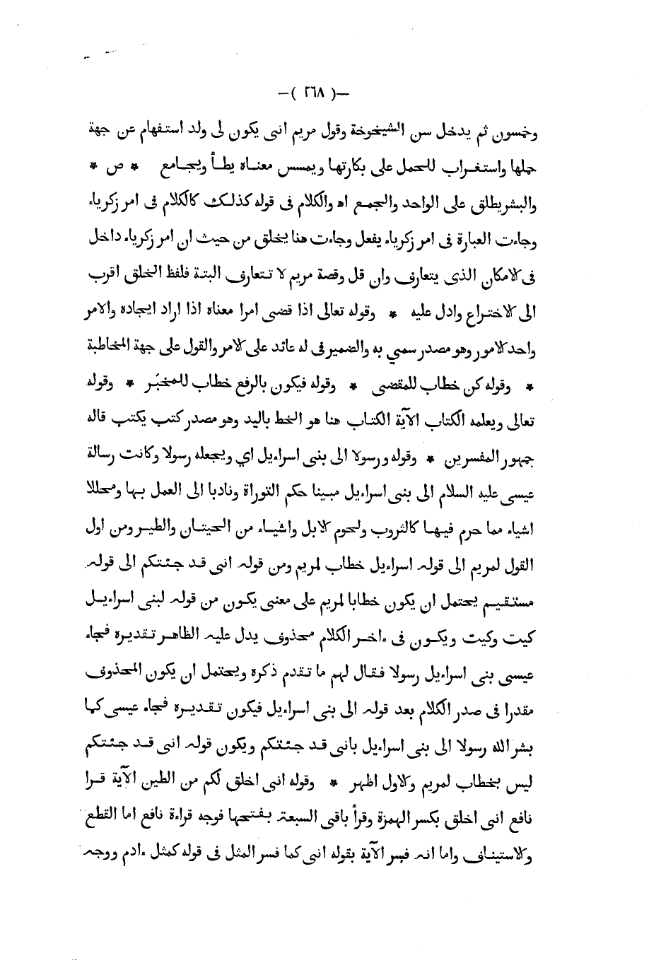 وخمسون ثم يدخل سن الشيخوخة وقول مريم أنى يكون لي ولد استفهام عن جهة حملها واسغراب للحمل على بكارتها ويمسس معناه يطأ ويجامع ص والبشر يطلق على الواحد والجمع أ ه والكلام في قوله كذلك كالكلام في أمر زكريا وجاءت العبارة في أمر زكريا يفعل وجاءت هنا يخلق من حيث أن أمر زكريا داخل في الإمكان الذي يتعارف وأن قل وقصة مريم لا تتعارف البتة فلفظ الخلق أقرب إلى الاختراع وأدل عليه وقوله تعالى إذا قضى أمرا معناه إذا أراد ايجاده والأمر واحد الأمور وهو مصدر رسمي به والضمير في له عائد على الأمر والقول على جهة المخاطبة وقوله كن خطاب للمقضى وقوله فيكون بالرفع خطاب للمخبر وقوله تعالى ويعلمه الكتاب الآية الكتاب هنا هو الخط باليد وهو مصدر كتب يكتب قاله جمهور المفسرين وقوله ورسولا إلى بني إسرائيل أي ويجعله رسولا وكانت رسالة عيسى عليه السلام إلى بني إسرائيل مبينا حكم التوراة ونابا إلى العمل بها ومحللا أشياء مما حرم فيها كالثروب ولحوم الإبل وأشياء من الحيتان والطير ومن أول القول لمريم إلى قوله إسرائيل خطاب لمريم ومن قوله أنى قد جئتكم إلى قوله مستقيم يحتمل أن يكون خطابا لمريم على معنى يكون من قوله لبني إسرائيل كيت وكيت ويكون في آخر الكلام محذوف يدل عليه الظاهر تقديره فجاء عيسى بني إسرائيل رسولا فقال لهم ما تقدم ذكره ويحتمل أن يكون المحذوف مقدرا ف يصدر الكلام بعد قوله إلى بني إسرائيل فيكون تقديره فجاء عيسى كما بشر الله رسولا إلى بني إسرائيل بأني قد جئتكم ويكون قوله أني قد جئتكم ليس بخطاب لمريم والأول أظهر وقوله أنى أخلق لكم من الطين الآية قرأ نافع أنى أخلق بكسر الهمزة وقرأ باقي السبعة بفتحها فوجه قراءة نافع أما القطع والاستيناف وأما أنه فسر الآية بقوله أنى كما فسر المثل في قوله كمثل آدم ووجه