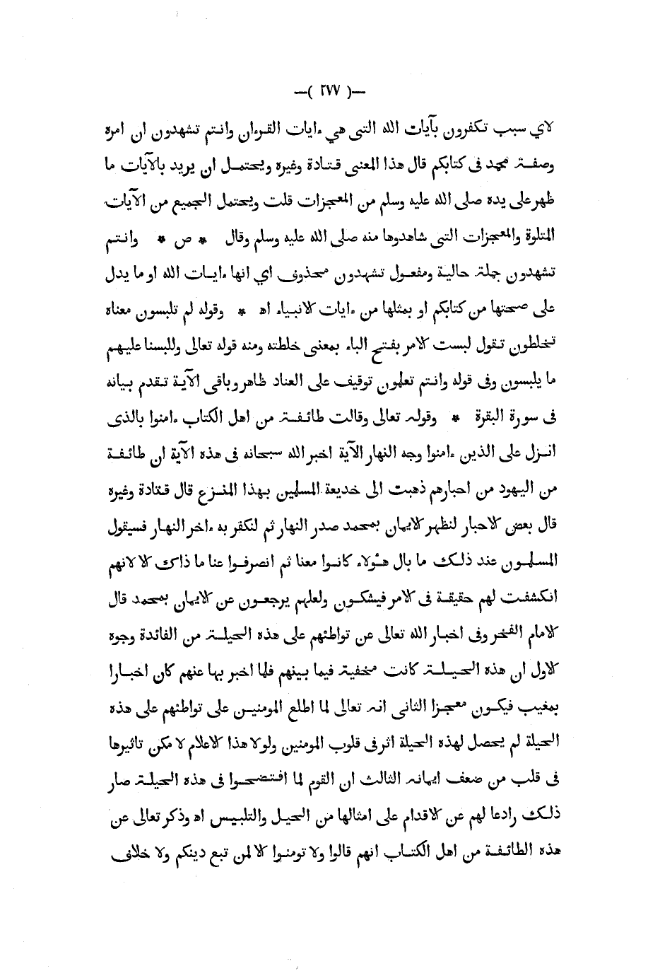 لأي سبب تكفرون بآيات الله التي هي آيات القرآن وأنتم تشهدون ان أمره وصفة محمد في كتابكم قال هذا المعنى قتادة وغيره ويحتمل أن يريد بالآيات ما ظهر على يده صلى الله عليه و سلم من المعجزات قلت ويحتمل الجميع من الآيات المتلوة والمعجزات التي شاهدوها منه صلى الله عليه و سلم وقال ص وأنتم تشهدون جملة حالية ومفعول تشهدون محذوف أي أنها ايات الله أو ما يدل على صحتها من كتابكم أو بمثلها من آيات الأنبياء أ ه وقوله لم تلبسون معناه تخلطون تقول لبست الأمر بفتح الباء بمعنى خلطته ومنه قوله تعالى وللبسنا عليه ما يلبسون وفي قوله وأنتم تعلمون توقيف على العناد ظاهر وباقي الآية تقدم بيانه في سورة البقرة وقوله تعالى وقالت طائفة من أهل الكتاب آمنوا بالذي أنزل على الذين أمنوا وجه النهار الآية اخبر رالله سحبانه في هذه الآية أن طائفة من اليهود من أحبارهم ذهبت إلى خديعة المسلمين بهذا المنزع قال قتادة وغيره قال بعض الأحبار لنظهر الإيمان بمحمد صدر النهار ثم لنكفر به آخر النهار فسيقول المسلمون عند ذلك ما بال هؤلاء كانوا معنا ثم انصرفوا عنا ما ذاك الا لانهم انكشفت لهم حقيقة في الأمر فيشكون ولعلهم يرجعون عن الإيمان بمحمد قال الإمام الفخر وفي أخبار الله تعالى عن تواطئهم على هذه الحيلة من الفائدة وجوه الأول أن هذه الحيلة كانت مخفية فيما بينهم فلما أخبر بها عنهم كان إخبارا بمغيب فيكون معجزا الثاني أنه تعالى لما أطلع المؤمنين على تواطئهم على هذه الحيلة لم يحصل لهذه الحيلة أثر في قلوب المؤمنين ولولا هذا الإعلام لأمكن تأثيرها في قلب من ضعف إيمانه الثالث أن القوم لما إفتضحوا في هذه الحيلة صار ذلك رادعا لهم عن الإقدام على أمثالها من الحيل والتلبيس أ ه وذكر تعالى عن هذه الطائفة من أهل الكتاب أنهم قالوا ولا تؤمنوا إلا لمن تبع دينكم ولا خلاف