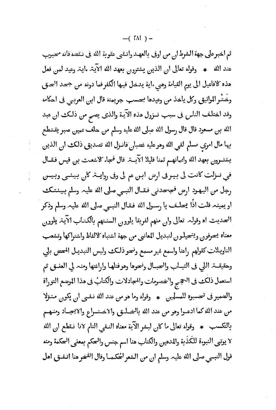 ثم أخبر على جهة الشرط إن أوفى بالعهد واتقى عقوبة الله في نقضه فإنه محبوب عند الله وقوله تعالى أن الذين يشترون بعهد الله الآية أية وعيد لمن فعل هذه الأفاعيل إلى يوم القيامة وهي أية يدخل فيها الكفر فما دونه من جحد الحق وختر المواثيق وكل يأخذ من وعيدها بحسب جريمته قال ابن العربي في أحكامة وقد أختلف الناس في سبب نزول هذه الآية والذي يصح من ذلك أن عبد الله بن مسعود قال قال رسول الله صلى الله عليه و سلم من حلف يمين صبر يقتطع بها مال أمري مسلم لقي الله وهو عليه غضبان فأنزل الله تصديق ذلك أن الذين يشترون بعهد الله وأيمانهم ثمنا قليلا الآية قال فجاء الأشعث بن قيس فقال في نزلت كانت لي بير في أرض ابن عم لي وفي رواية كان بيني وبين رجل من اليهود أرض فجحدني فقال النبي صلى الله عليه و سلم بينتك وذكر أو يمينه قلت إذا يحلف يا رسول الله فقال النبي صلى الله عليه و سلم وذكر الحديث اه وقوله تعالى وإن منهم لفريقا يلوون السنتهم بالكتاب الآية يلوون معناه يحرفون ويتحيلون لتبديل المعاني من جهة أشتباه الألفاظ واشتراكها وتشعب التأويلات كقولهم راعنا واسمع غير مسمع ونحو ذلك وليس التبديل المحض بلي وحقيقة اللي في الثياب والحبال ونحوها وهو فتلها واراغتها ومنه لي العنق ثم أستعمل ذلك في الحجج والخصومات والمجادلات والكتاب في هذا الموضع التوراة والضمير في تحسبوه للمسلمين قوله وما هو من عند الله نفي أن يكون منزلا من عند الله كما ادعوا وهو من عند الله بالخلق والاختراع والإيجاد ومنهم بالتكسب وقوله تعالى ما كان لبشر الآية معناه النفي التام لانا نقطع أن الله لا يؤتى النبوءة للكذبة والمدعين والكتاب هنا اسم جنس والحكم بمعنى الحكمة ومنه قول النبي صلى الله عليه و سلم أن من الشعر لحكما وقال الفخر هنا اتفق أهل