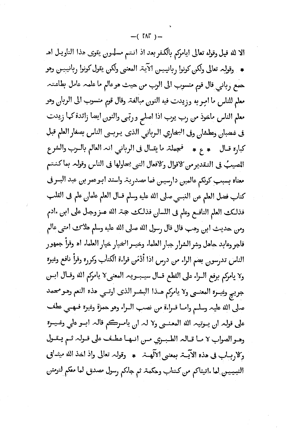 إلا لله قيل وقوله تعالى أيأمركم بالكفر بعد إذ أنتم مسلمون يقوى هذا التأويل ا ه وقوله تعالى ولكن كونوا ربانيين الآية المعنى ولكن يقول كونوا ربانيين وهو جمع رباني قال قوم منسوب إلى الرب من حيث هو عالم ما علمه عامل بطاعته معلم للناس ما أمر به وزيدت فيه النون مبالغة وقال قوم منسوب إلى الربان وهو معلم الناس مأخوذ من رب يرب إذا أصلح وربى والنون أيضا زائدة كما زيدت في غضبان وعطشان وفي البخاري الرباني الذي يربى الناس بصغار العلم قبل كباره قال ع فجملة ما يقال في الرباني أنه العالم بالرب والشرع المصيب في التقدير من الأقوال والأفعال التي يحاولها في الناس وقوله بما كنتم معناه بسبب كونكم عالمين دارسين فما مصدرية وأسند أبو عمر بن عبد البر في كتاب فضل العلم عن النبي صلى الله عليه و سلم قال العلم علمان علم في القلب فذلك العلم النافع وعلم في اللسان فذلك حجة الله عز و جل على ابن أدم ومن حديث ابن وهب قال قال رسول الله صلى الله عليه و سلم هلاك أمتي عالم فاجر وعابد جاهل وشر الشرار جبار العلماء وخير الخيار خيار العلماء ا ه وقرأ جمهور الناس تدرسون بضم الراء من درس إذا أدمن قراءة الكتاب وكرره وقرأ نافع وغيره ولا يأمركم برفع الراء على القطع قال سيبويه المعنى لا يأمركم الله وقال ابن جريج وغيره المعنى ولا يأمركم هذا البشر الذي أوتي هذه النعم وهو محمد صلى الله عليه و سلم وأما قراءة من نصب الراء وهو حمزة وغيره فهي عطف على قوله أن يوتيه الله المعنى ولا له أن يأمركم قاله أبو علي وغيره وهو الصواب لا ما قاله الطبري من أنها عطف على قوله ثم يقول والأرباب في هذه الآية بمعنى الآلهة وقوله تعالى وإذ أخذ الله ميثاق النبيين لما ءاتيناكم من كتاب وحكمة ثم جاءكم رسول مصدق لما معكم لتؤمنن