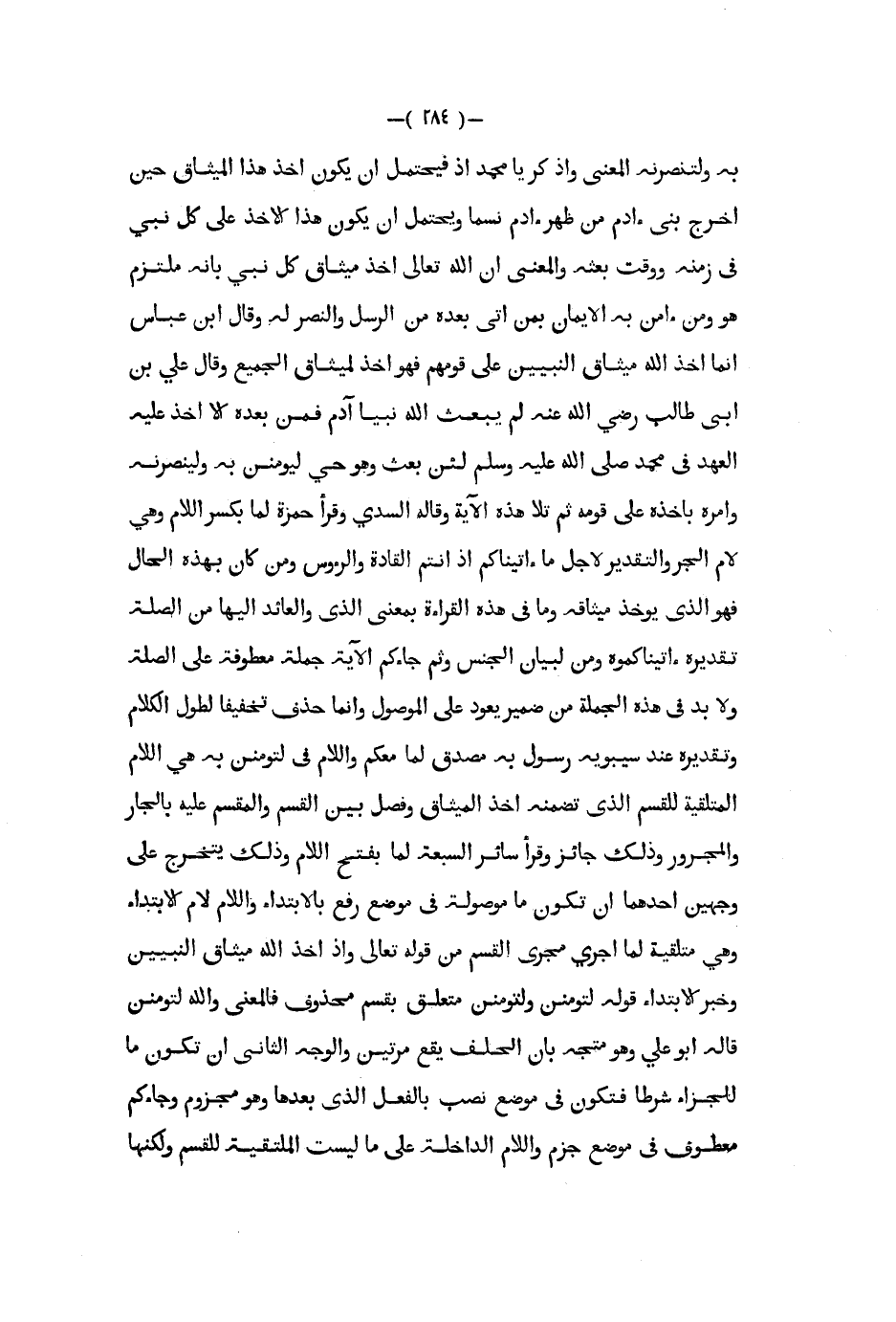 به ولتنصرنه المعنى واذكر يا محمد إذ فيحتمل أن يكون أخذ هذا الميثاق حين أخرج بني ءادم من ظهر ءادم نسما ويحتمل أن يكون هذا الأخذ على كل نبي في زمنه ووقت بعثه والمعنى أن الله تعالى أخذ ميثاق كل نبي بأنه ملتزم هو ومن ءامن به الإيمان بمن أتى بعده من الرسل والنصر له وقال ابن عباس إنما أخذ الله ميثاق النبيين على قومهم فهو أخذ لميثاق الجميع وقال علي بن أبي طالب رضي الله عنه لم يبعث الله نبيا آدم فمن بعده إلا أخذ عليه العهد في محمد صلى الله عليه و سلم لئن بعث وهو حي ليؤمنن به ولينصرنه وأمره بأخذه على قومه ثم تلا هذه الآية وقاله السدي وقرأ حمزة لما بكسر اللام وهي لام الجر والتقدير لأجل ما آتيناكم إذ أنتم القادة والرؤوس ومن كان بهذه الحال فهو الذي يؤخذ ميثاقه وما في هذه القراءة بمعنى الذي والعائد إليها من الصله تقديره آتيناكموه ومن لبيان الجنس وثم جاءكم الآية جملة معطوفة على الصلة ولا بد في هذه الجملة من ضمير يعود على الموصول وإنما حذف تخفيفا لطول الكلام وتقديره عند سيبويه رسول به مصدق لما معكم واللام في لتؤمنن به هي اللام المتلقية للقسم الذي تضمنه أخذ الميثاق وفصل بين القسم والمقسم عليه بالجار والمجرور وذلك جائز وقرأ سائر السبعة لما بفتح اللام وذلك يتخرج على وجهين أحدهما أن تكون ما موصولة في موضع رفع بالابتداء واللام لام الابتداء وهي متلقية لما اجري مجرى القسم من قوله تعالى وإذ أخذ الله ميثاق النبيين وخبر الابتداء قوله لتؤمنن ولتؤمنن متعلق بقسم محذوف فالمعنى والله لتؤمنن قاله أبو علي وهو متجه بأن الحلف يقع مرتين والوجه الثاني أن تكون ما للجزاء شرطا فتكون في موضع نصب بالفعل الذي بعدها وهو مجزوم وجاءكم معطوف في موضع جزم واللام الداخلة على ما ليست الملتقية للقسم ولكنها