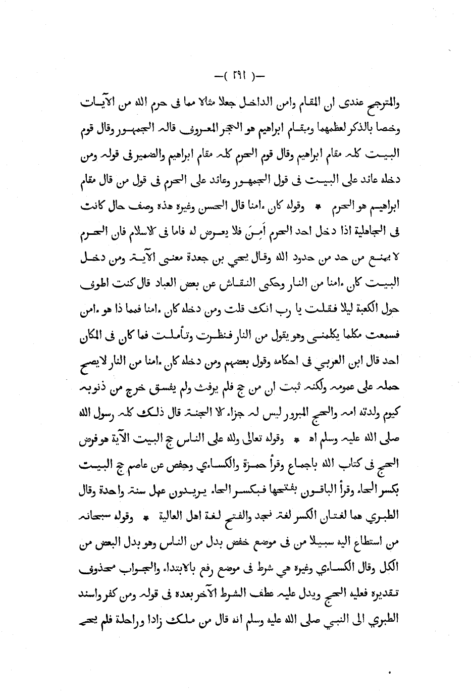 والمترجح عندي ان المقام وأمن الداخل جعلا مثالا مما في حرم الله من الآيات وخصا بالذكر لعظمهما مقام إبراهيم هو الحجر المعروف قاله الجمهور وقال قوم البيت كله مقام إبراهيم وقال قوم الحرم كله مقام إبراهيم والضمير في قوله ومن دخله عائد على البيت في قول الجمهور وعائد على الحرم في قول من قال مقام إبراهيم هو الحرم وقوله كان آمنا قال الحسن وغيره هذه وصف حال كانت في الجاهلية إذا دخل أحد الحرم امن فلا يعرض له فأما في الإسلام فإن الحرم لا يمنع من حد من حدود الله وقال يحيى بن جعدة معنى الآية ومن دخل البيت كان آمنا من النار وحكى النقاش عن بعض العباد قال كنت أطوف حول الكعبة ليلا فقلت يا رب أنك قلت ومن دخله كان آمنا فمما ذا هوآمن فسمعت مكلما يكلمني وهو يقول من النار فنظرت وتأملت فما كان في المكان أحد قال ابن العربي في أحكامه وقول بعضهم ومن دخله كان آمنا من النار لا يصح حمله على عمومه ولكنه ثبت ان من حج فلم يرفث ولم يفسق خرج من ذنوبه كيوم ولدته أمه والحج المبرور ليس له جزاء إلا الجنة قال ذلك كله رسول الله صلى الله عليه و سلم اه وقوله تعالى ولله على الناس حج البيت الآية هو فرض الحج في كتاب الله بإجماع وقرأ حمزة والكساءي وحفص عن عاصم حج البيت بكسر الحاء وقرأ الباقون بفتحها فبكسر الحاء يريدون عمل سنة واحدة وقال الطبري هما لغتان الكسر لغة نجد والفتح لغة أهل العالية وقوله سبحانه من استطاع إليه سبيلا من في موضع خفض بدل من الناس وهو بدل البعض من الكل وقال الكساءي وغيره هي شرط في موضع رفع بالابتداء والجواب محذوف تقديره فعليه الحج ويدل عليه عطف الشرط الآخر بعده في قوله ومن كفر وأسند الطبري إلى النبي صلى الله عليه و سلم أنه قال من ملك زادا وراحله فلم يحج