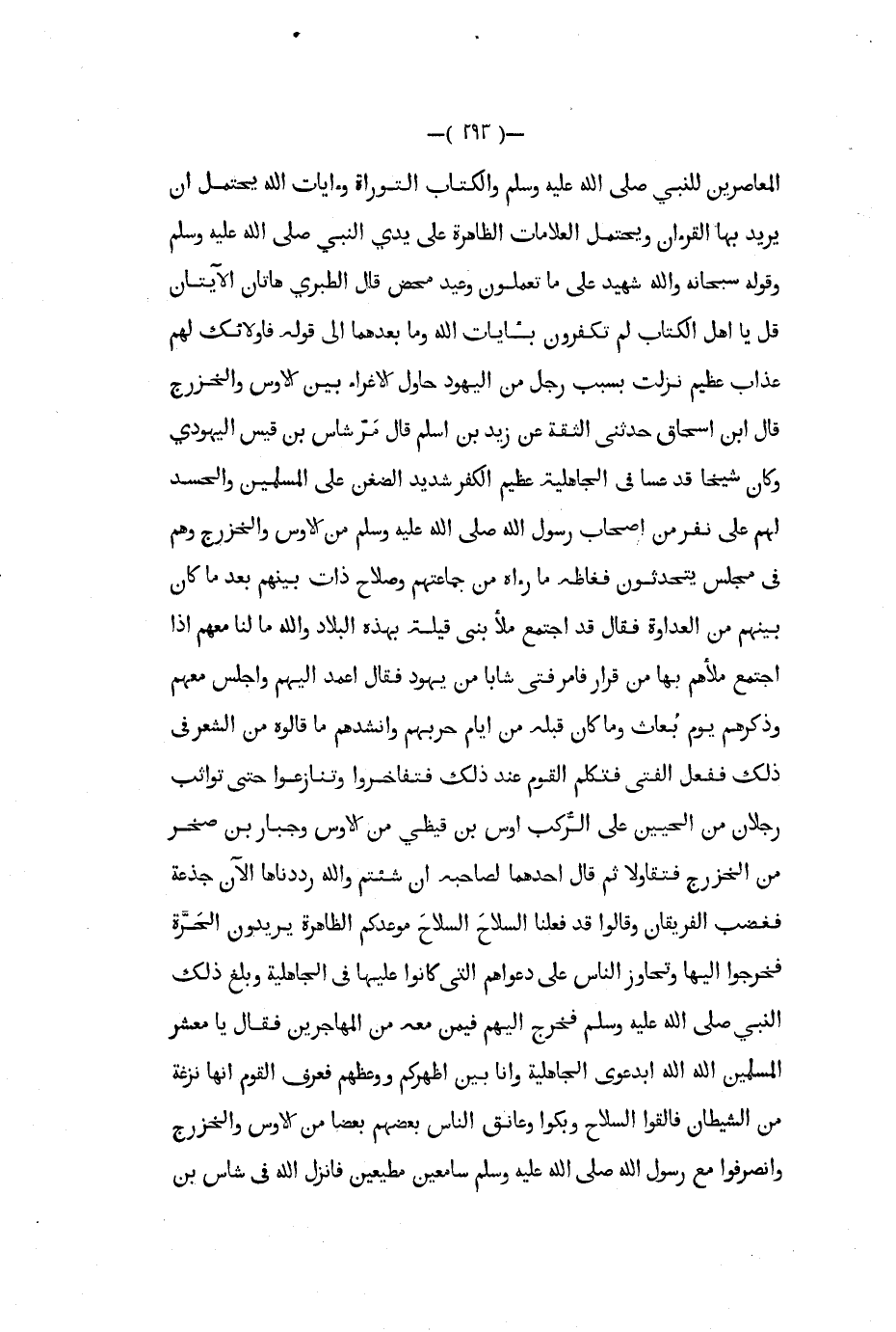 المعاصرين للنبي صلى الله عليه و سلم والكتاب التوراة وآيات الله يحتمل أن يريد بها القرءان ويحتمل العلامات الظاهرة على يدي النبي صلى الله عليه و سلم وقوله سبحانه والله شهيد على ما تعملون وعيد محض قال الطبري هاتان الآيتان قل يا أهل الكتاب لم تكفرون بآيات الله وما بعدهما إلى قوله فاولائك لهم عذاب عظيم نزلت بسبب رجل من اليهود حاول الإغراء بين الأوس والخزرج قال ابن إسحاق حدثني الثقة عن زيد بن أسلم قال مر شاس بن قيس اليهودي وكان شيخا قد عسا في الجاهلية عظيم الكفر شديد الضغن على المسلمين والحسد لهم على نفر من أصحاب رسول الله صلى الله عليه و سلم من الأوس والخزرج وهم في مجلس يتحدثون فغاظه ما رآه من جماعتهم وصلاح ذات بينهم بعد ما كان بينهم من العداوة فقال قد أجتمع ملأ بني قيلة بهذه البلاد والله مالنا معهم إذا اجتمع ملأهم بها من قرار فأمر فتى شابا من يهود فقال أعمد إليهم واجلس معهم وذكرهم يوم بعاث وما كان قبله من أيام حربهم وأنشدهم ما قالوه من الشعر في ذلك ففعل الفتى فتكلم القوم عند ذلك فتفاخروا وتنازعوا حتى تواثب رجلان من الحيين على الركب أوس بن قيظي من الأوس وجبار بن صخر من الخزرج فتقاولا ثم قال أحدهما لصاحبه إن شئتم والله رددناها الآن جذعة فغضب الفريقان وقالوا قد فعلنا السلاح السلاح موعدكم الظاهرة يريدون الحرة فخرجوا إليها وتحاوز الناس على دعواهم التي كانوا عليها في الجاهلية وبلغ ذلك النبي صلى الله عليه و سلم فخرج إليهم فيمن معه من المهاجرين فقال يا معشر المسلمين الله الله ابدعوى الجاهلية وأنا بين أظهركم ووعظهم فعرف القوم أنها نزعة من الشيطان فالقوا السلاح وبكوا وعانق الناس بعضهم بعضا من الأوس والخزرح وانصرفوا مع رسول الله صلى الله عليه و سلم سامعين مطيعين فأنزل الله في شاس بن