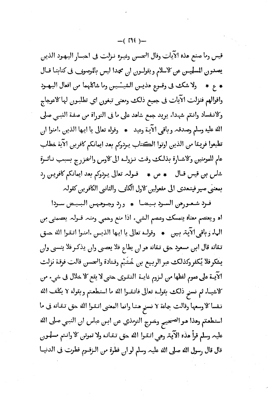 ويعتصم معناه يتمسك وعصم الشيء إذامنع وحمي ومنه قوله يعصمني من الماء وباقي الآية بين وقوله تعالى يا أيها الذين أمنوا اتقوا الله حق تقاته قال ابن مسعود حق تقاته هوأن يطاع فلا يعصى وأن يذكر فلا ينسى وأن يشكر فلا يكفر وكذلك عبر الربيع بن خثيم وقتادة والحسن قالت فرقة نزلت الآية على عموم لفظها من لزوم غاية التقوى حتى لا يقع إلا خلال في شيء من الأشياء ثم نسخ ذلك بقوله تعالى فاتقوا الله ما استطعتم وبقوله لا يكلف الله نفسا إلا وسعها وقالت جماعة لا نسخ هنا وإنما المعنى اتقوا الله حق تقاته في ما استطعتم وهذا هو الصحيح وخرج الترمذي عن ابن عباس ان النبي صلى الله عليه و سلم قرأ هذه الآية وهي اتقوا الله حق تقاته ولا تموتن إلا وأنتم مسلمون قال قال رسول الله صلى الله عليه و سلم لو أن قطرة من الزقوم قطرت في الدنيا