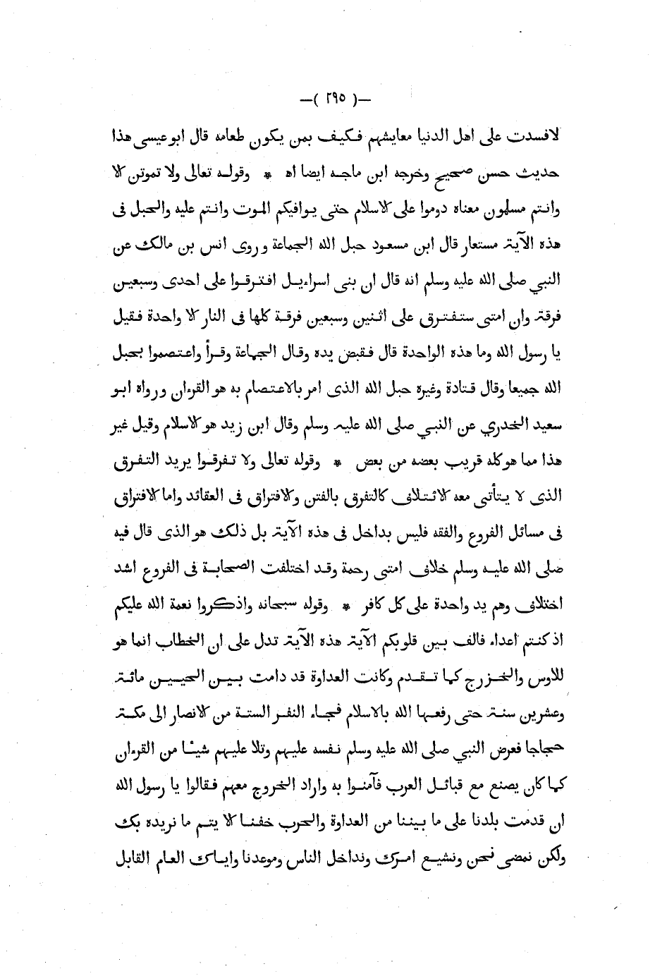لأفسدت على أهل الدنيا معايشهم فكيف بمن يكون طعامه قال أبو عيسى هذا حديث حسن صحيح وخرجه ابن ماجه أيضا اه وقوله تعالى ولا تموتن إلا وأنتم مسلمون معناه دوموا على الإسلام حتى يوافيكم الموت وأنتم عليه والحبل في هذه الآية مستعار قال ابن مسعود حبل الله الجماعة وروى أنس بن مالك عن النبي صلى الله عليه و سلم أنه قال أن بني إسرائيل افترقوا على إحدى وسبعين فرقة وأن أمتي ستفترق على اثنين وسبعين فرقة كلها في النار إلا واحدة فقيل يا رسول الله وما هذه الواحدة قال فقبض يده وقال الجماعة وقرأ واعتصموا بحبل الله جميعا وقال قتادة وغيره حبل الله الذي أمر بالاعتصام به هو القرءان ورواه أبو سعيد الخدري عن النبي صلى الله عليه و سلم وقال ابن زيد هو الإسلام وقيل غير هذا مما هو كله قريب بعضه من بعض وقوله تعالى ولا تفرقوا يريد التفرق الذي لا يتأتى معه الائتلاف كالتفرق بالفتن والافتراق في العقائد وأما الافتراق في مسائل الفروع والفقه فليس بداخل في هذه الآية بل ذلك هوالذي قال فيه صلى الله عليه و سلم خلاف أمتي رحمة وقد اختلفت الصحابة في الفروع أشد اختلاف وهم يد واحدة على كل كافر وقوله سبحانه وأذكروا نعمة الله عليكم إذ كنتم أعداء فألف بين قلوبكم الآية هذه الآية تدل على أن الخطاب إنما هو للأوس والخزرج كما تقدم وكانت العدواه قد دامت بين الحيين مائة وعشرين سنة حتى رفعها الله بالإسلام فجاء النفر الستة من الأنصار إلى مكة حجاجا فعرض النبي صلى الله عليه و سلم نفسه عليهم وتلا عليهم شيئا من القرآن كما كان يصنع مع قبائل العرب فآمنوا به وأراد الخروج معهم فقالوا يا رسول الله إن قدمت بلدنا على ما بيننا من العداوة والحرب خفنا إلا يتم مانريده بك ولكن نمضي نحن ونشيع أمرك ونداخل الناس وموعدنا وإياك العام القابل