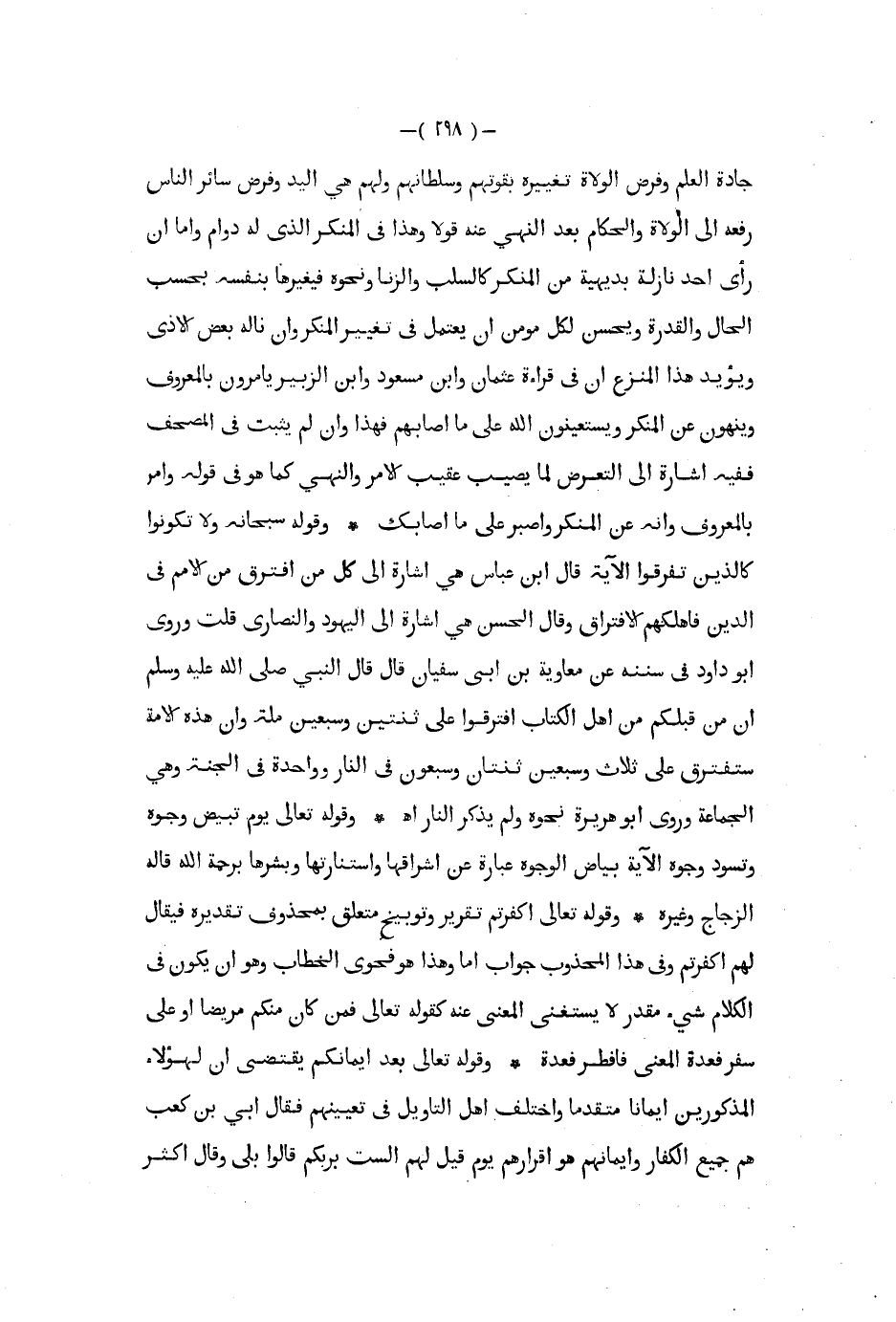 جادة العلم وفرض الولاة تغييره بقوتهم وسلطانهم ولهم هي اليد وفرض سائر الناس رفعه إلى الولاة والحكام بعد النهي عنه قولا وهذا في المنكر الذي له دوام وإما أن رأى أحد نازلة بديهية من المنكر كالسلب والزنا ونحوه فيغيرها بنفسه بحسب الحال والقدرة ويحسن لكل مؤمن أن يعتمل في تغيير المنكر وإن ناله بعض الأذى ويؤيد هذا المنزع أن في قراءة عثمان وابن مسعود وابن الزبير يأمرون بالمعروف وينهون عن المنكر ويستعينون الله على ما أصابهم فهذا وإن لم يثبت في المصحف ففيه إشارة إلى التعرض لما يصيب عقيب الأمر والنهي كما هو في قوله وأمر بالمعروف وأنه عن المنكر واصبر على ما أصابك وقوله سبحانه ولا تكونوا كالذين تفرقوا الآية قال أبن عباس هي إشارة إلى كل من افترق من الأمم في الدين فأهلكهم الإفتراق وقال الحسن هي إشارة إلى اليهود والنصارى قلت وروى ابو داود في سننه عن معاوية بن أبي سفيان قال قال النبي صلى الله عليه و سلم أن من قبلكم من أهل الكتاب أفترقوا على ثنتين وسبعين ملة وأن هذه الأمة ستفترق على ثلاث وسبعين ثنتان وسبعون في النار وواحدة في الجنة وهي الجماعة وروى أبو هريرة نحوه ولم يذكر النار ا ه وقوله تعالى يوم تبيض وجوه وتسود وجوه الآية بياض الوجوه عبارة عن إشراقها واستنارتها وبشرها برحمة الله قاله الزجاج وغيره وقوله تعالى أكفرتم تقرير وتوبيخ متعلق بمحذوف تقديره فيقال لهم اكفرتم وفي هذا المحذوب جواب أما وهذا هو فحوى الخطاب وهو أن يكون في الكلام شيء مقدر لا يستغنى المعنى عنه كقوله تعالى فمن كان منكم مريضا أو على سفر فعدة المعنى فافطر فعدة وقوله تعالى بعد ايمانكم يقتضى أن لهؤلاء المذكورين أيمانا متقدما وأختلف أهل التأويل في تعيينهم فقال أبي بن كعب هم جميع الكفار وإيمانهم هو إقرارهم يوم قيل لهم الست بربكم قالوا بلى وقال أكثر