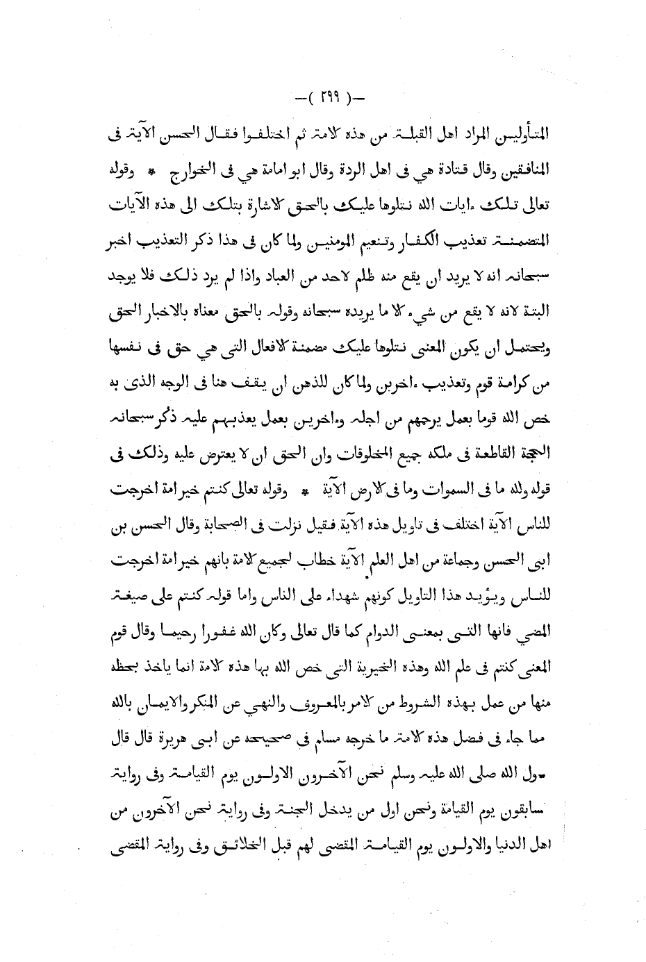 المتأولين المراد أهل القبلة من هذه الأمة ثم اختلفوا فقال الحسن الآية في المنافقين وقال قتادة هي في أهل الردة وقال أبو أمامة هي في الخوارج وقوله تعالى تلك ءايات الله نتلوها عليك بالحق الإشارة بتلك إلى هذه الآيات المتضمنة تعذيب الكفار وتنعيم المؤمنين ولما كان في هذا ذكر التعذيب أخبر سبحانه أنه لا يريد أن يقع منه ظلم لأحد من العباد وإذا لم يرد ذلك فلا يوجد البتة لأنه لا يقع من شيء إلا ما يريده سبحانه وقوله بالحق معناه بالإخبار الحق ويحتمل أن يكون المعنى نتلوها عليك مضمنة الأفعال التي هي حق في نفسها من كرامة قوم وتعذيب ءاخرين ولما كان للذهن أن يقف هنا في الوجه الذي به خص الله قوما بعمل يرحمهم من أجله وءاخرين بعمل يعذبهم عليه ذكر سبحانه الحجة القاطعة في ملكة جميع المخلوقات وأن الحق أن لا يعترض عليه وذلك في قوله ولله ما في السموات وما في الأرض الآية وقوله تعالى كنتم خيرأمة أخرجت للناس الآية اختلفت في تأويل هذه الآية فقيل نزلت في الصحابة وقال الحسن بن أبي الحسن وجماعة من أهل العلم الآية خطاب لجميع الأمة بأنهم خير أمة أخرجت للناس ويؤيد هذا التأويل كونهم شهداء على الناس وأما قوله كنتم على صيغة المضي فإنها التي بمعنى الدوام كما قال تعالى وكان الله غفورا رحيما وقال قوم المعنى كنتم في علم الله وهذه الخيرية التي خص الله بها هذه الآمة إنما يأخذ بحظه منها من عمل بهذه الشروط من الآمر بالمعروف والنهي عن المنكر والإيمان بالله مما جاء في فضل هذه الأمة ما خرجه مسلم في صحيحه عن أبي هريرة قال قال رسول الله صلى الله عليه و سلم نحن الآخرون الأولون يوم القيامة وفي رواية مسابقون يوم القيامة ونحن أول من يدخل الجنة وفي رواية نحن الآخرون من أهل الدنيا والاولون يوم القيامة المقضى لهم قبل الخلائق وفي رواية المقضى