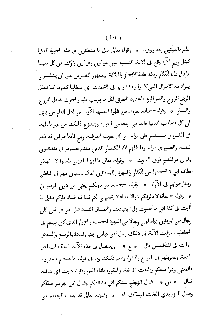 عليم بالمتقين وعد ووعيد وقوله تعالى مثل ما ينفقون في هذه الحيوة الدنيا كمثل ريح الآية وقع في الآية التشبيه بين شيئين وشيئين وترك من كل منهما مادل عليه الكلام وهذه غاية الإيجاز والبلاغة وجمهور المفسرين على أن ينفقون يراد به الأموال التي كانوا ينفقونها في التحنث ا يبطلها كفرهم كما تبطل الريح الزرع والصر البرد الشديد المحرق لكل ما يهب عليه والحرث شامل للزرع والثمار وقوله سبحانه حرث قوم ظلموا أنفسهم الآية من أهل العلم من يرى أن كل مصائب الدنيا فإنما هي بمعاصي العبيد وينتزع ذلك من غير ما آية في القرآن فيستقيم على قوله إن كل حرث تحرقه ريح فإنما هو لمن قد ظلم نفسه والضمير في قوله وما ظلمهم الله للكفار الذين تقدم ضميرهم في ينفقون وليس هو للقوم ذوي الحرث وقوله تعالى يا أيها الذين أمنوا لا تتخذوا بطانة أي لا تتخذوا من الكفار واليهود والمنافقين أخلاء تأنسون بهم في الباطن وتفاوضونهم في الآراء وقوله سبحانه من دونكم يعني من دون المؤمنين وقوله سبحانه لا يالونكم خبالا معناه لا يقصرون لكم فيما فيه فساد عليكم تقول ما ألوت في كذا أي ما قصرت بل اجتهدت والخبال الفساد قال ابن عباس كان رجال من المؤمنين يواصلون رجالا من الهيود للحلف والجوار الذي كان بينهم في الجاهلية فنزلت الآية في ذلك وقال ابن عباس أيضا وقتادة والربيع والسدي نزلت في المنافقين قال ع ويدخل في هذه الآية استكتاب أهل الذمة وتصريفهم في البيع والشراء ونحو ذلك وما في قوله ما عتنم مصدرية فالمعنى ودوا عنتكم والعنت المشقة والمكروه يلقاه المرء وعقبة عنوت أي شاقة قال ص قال الزجاج عنتكم أي مشقتكم وقال ابن جرير ضلالكم وقال الزبيدي العنت الهلاك اه وقوله تعالى قد بدت البغضاء من