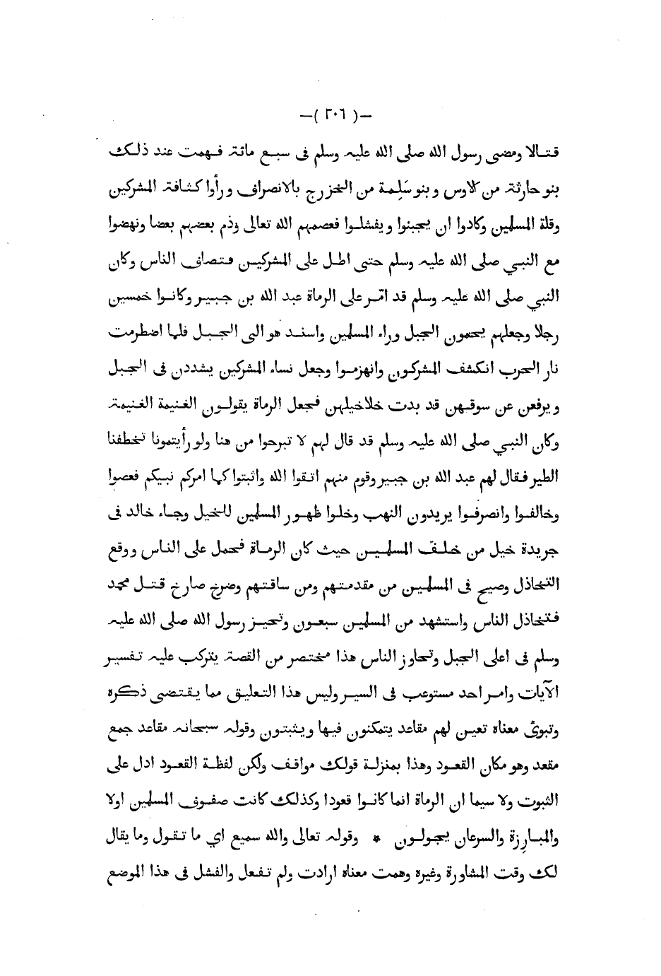 قتالا ومضى رسول الله صلى الله عليه و سلم في سبع مائة فهمت عند ذلك بنو حارثة من الأوس وبنو سلمة من الخزرج بالإنصراف ورأوا كثافة المشركين وقلة المسلمين وكادوا أن يجبنوا ويفشلوا فعصمهم الله تعالى وذم بعضهم بعضا ونهضوا مع النبي صلى الله عليه و سلم حتى أطل على المشركين فتصاف الناس وكان النبي صلى الله عليه و سلم قد أمر على الرماة عبد الله بن جبير وكانوا خمسين رجلا وجعلهم يحمون الجبل وراء المسلمين وأسند هو إلى الجبل فلما اضطرمت نار الحرب انكشف المشركون وانهزموا وجعل نساء المشركين يشددن في الجبل ويرفعن عن سوقهن قد بدت خلاخيلهن فجعل الرماة يقولون الغنيمة الغنيمة وكان النبي صلى الله عليه و سلم قد قال لهم لا تبرحوا من هنا ولو رأيتمونا تخطفنا الطير فقال لهم عبد الله بن جبير وقوم منهم اتقوا الله واثبتوا كما أمركم نبيكم فعصوا وخالفوا وانصرفوا يريدون النهب وخلوا ظهور المسلمين للخيل وجاء خالد في جريدة خيل من خلف المسلمين حيث كان الرماة فحمل على الناس ووقع التخاذل وصيح في المسلمين من مقدمتهم ومن ساقتهم وصرخ صارخ قتل محمد فتخاذل الناس واستشهد من المسلمين سبعون وتحيز رسول الله صلى الله عليه و سلم في أعلى الجبل وتحاوز الناس هذا مختصر من القصة يتركب عليه تفسير الآيات وأمر أحد مستوعب في السير وليس هذا التعليق مما يقتضي ذكره وتبوىء معناه تعين لهم مقاعد يتمكنون فيها ويثبتون وقوله سبحانه مقاعد جمع مقعد وهو مكان القعود وهذا بمنزلة قولك مواقف ولكن لفظة القعود أدل على الثبوت ولا سيما أن الرماة إنما كانوا قعودا وكذلك كانت صفوف المسلمين أولا والمبارزة والسرعان يجولون وقوله تعالى والله سميع أي ما تقول وما يقال لك وقت المشاروة وغيره وهمت معناه أرادت ولم تفعل والفشل في هذا الموضع