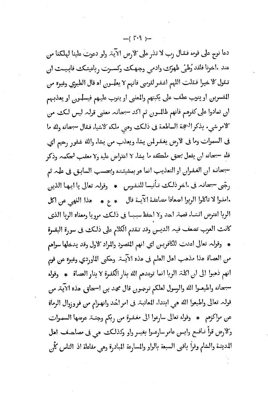 دعا نوح على قومه فقال رب لا تذر على الأرض الآية ولو دعوت علينا لهلكنا من عند آخرنا فلقد وطىء ظهرك وادمي وجهك وكسرت رباعيتك فأبيت أن تقول إلا خيرا فقلت اللهم اغفر لقومي فأنهم لا يعلمون اه قال الطبري وغيره من المفسرين أو يتوب عطف على يكبتهم والمعنى أو يتوب عليهم فيسلمون أو يعذبهم إن تمادوا على كفرهم فإنهم ظالمون ثم أكد سبحانه معنى قوله ليس لك من الأمر شيء بذكر الحجة الساطعة في ذلك وهي ملكه الأشياء فقال سبحانه وله ما في السموات وما في الأرض يغفر لمن يشاء ويعذب من يشاء والله غفور رحيم أي فله سبحانه أن يفعل بحق ملكه ما يشاء لا اعتراض عليه ولا معقب لحمكه وذكر سبحانه أن الغفران أو التعذيب إنما هو بمشيئته وبحسب السابق في علمه ثم رجى سبحانه في آخر ذلك تأنيسا للنفوس وقوله تعالى يا أيها الذين أمنوا لا تأكلوا الربوا أضعافا مضاعفة الآية قال ع هذا النهي عن أكل الربا اعترض أثناء قصمة أحد ولا أحفظ سببا في ذلك مرويا ومعناه الربا الذي كانت العرب تضعف فيه الدين وقد تقدم الكلام على ذلك في سورة البقرة وقوله تعالى اعدت للكفارين أي أنهم المقصود والمراد الأول وقد يدخلها سواهم من العصاة هذا مذهب أهل العلم في هذه الآية وحكى الماوردي وغيره عن قوم أنهم ذهبوا إلى أن أكلة الربا إنما توعدهم الله بنار الكفرة لا بنار العصاة وقوله سبحانه وأطيعوا الله والرسول لعلكم ترحمون قال محمد بن إسحاق هذه الآية من قوله تعالى وأيطعوا الله هي ابتداء المعاتبة في أمر احد وانهزام من فر وزوال الرماة عن مراكزهم وقوله تعالى سارعوا إلى مغفرة من ربكم وجنة عرضها السموات والأرض قرأ نافع وابن عامر سارعوا بغير واو وكذلك هي في مصاحب أهل المدينة والشام وقرأ باقي السبعة بالواو والمسارعة المبادرة وهي مفاعلة إذ الناس كأن