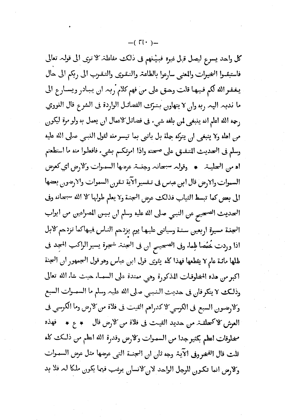 كل واحد يسرع ليصل قبل غيره فبينهم في ذلك مفاعلة إلا ترى إلى قوله تعالى فاستبقوا الخيرات والمعنى سارعوا بالطاعة والتقوى والتقرب إلى ربكم إلى حال يغفر الله لكم فيها قلت وحق على من فهم كلام ربه أن يبادر ويسارع إلى ما ندبه إليه ربه وأن لا يتهاون بترك الفضائل الواردة في الشرع قال النووي رحمه الله أعلم أنه ينبغي لمن بلغه شيء في فضائل الأعمال أن يعمل به ولو مرة ليكون من أهله ولا ينبغي أن يتركه جملة بل يأتي بما تيسر منه لقول النبي صلى الله عليه و سلم في الحديث المتفق على صحته وإذا أمرتكم بشيء فافعلوا منه ما استطعتم اه من الحلية وقوله سبحانه وجنة عرضها السموات والأرض أي كعرض السماوات والأرض قال ابن عباس في تفسير الآية تقرن السموات والأرضون بعضها إلى بعض كما تبسط الثياب فذلك عرض الجنة ولا يعلم طولها إلا الله سبحانه وفي الحديث الصحيح عن النبي صلى الله عليه و سلم أن بين المصراعين من أبواب الجنةمسيرة أربعين سنة وسيأتي عليها يوم يزدحم الناس فيها كما تزدحم الإبل إذا وردت خمصا ظماء وفي الصحيح أن في الجنة شجرة يسير الراكب المجد في ظلها مائة عام لا يقطعها فهذا كله يقوي قول ابن عباس وهو قول الجمهور أن الجنةأكبر من هذه المخلوقات المذكورة وهي ممتدة على السماء حيث شاء الله تعالى وذلك لا ينكر فإن في حديث النبي صلى الله عليه و سلم ما السماوات السبع والأرضون السبع في الكرسي إلا كدراهم ألقيت في فلاة من الأض وما الكرسي في العرش إلا كحلقة من حديد القيت في فلاة من الأرض قال ع فهذه مخلوقات أعظم بكثير جدا من السماوات والأرض وقدرة الله أعظم من ذلك كله قلت قال الفخر وفي الآية وجه ثان أن الجنة التي عرضها مثل عرض السماوات والأرض إنما تكون للرجل الواحد لأن الإنسان يرغب فيما يكون ملكا له فلا بد