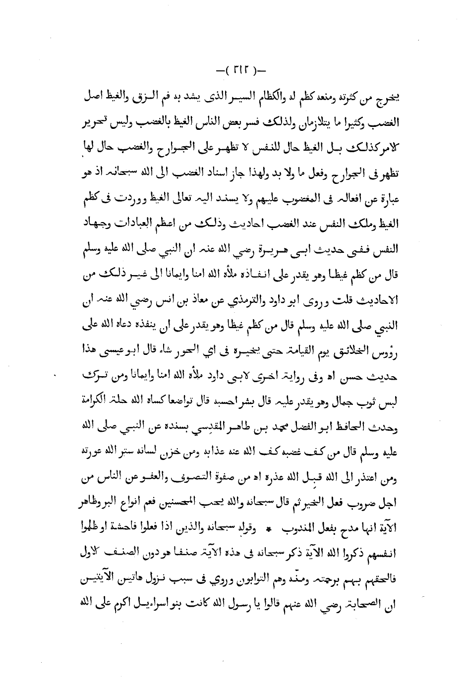يخرج من كثرته ومنعه كظم له والكظام السير الذي يشد به فم الزق والغيظ أصل الغضب وكثيرا ما يتلازمان ولذلك فسر بعض الناس الغيظ بالغضب وليس تحرير الأمر كذلك بل الغيظ حال للنفس لا تظهر على الجوراح والغضب حال لها تظهر في الجوارح وفعل ما ولا بد ولهذا جاز إسناد الغضب إلى الله سبحانه إذ هو عبارة عن افعاله في المغضوب عليهم ولا يسند إليه تعالى الغيظ ووردت في كظم الغيظ وملك النفس عند الغضب أحاديث وذلك من أعظم العبادات وجهاد النفس ففي حديث أبي هريرة رضي الله عنه أن النبي صلى الله عليه و سلم قال من عظم غيظا وهو يقدر على انفاذه ملأه الله أمنا وإيمانا إلى غير ذلك من الأحاديث قلت وروى أبو داود والترمذي عن معاذ بن أنس رضي الله عنه أن النبي صلى الله عليه و سلم قال من كظم غيظا وهو يقدر على أن ينفذه دعاه الله على رؤوس الخلائق يوم القيامة حتى يخيره في أي الحور شاء قال أبو عيسى هذا حديث حسن اه وفي رواية أخرى لابي داود ملأة الله أمنا وإيمانا ومن ترك لبس ثوب جمال وهو يقدر عليه قال بشر احسبه قال تواضعا كساه الله حلة الكرامة وحدث الحافظ أبو الفضل محمد بن طاهر المقدسي بسنده عن النبي صلى الله عليه و سلم قال من كف غضبه كف الله عنه عذابه ومن خزن لسانه ستر الله عورته ومن اعتذر إلى الله قبل الله عذره اه من صفوة التصوف والعفو عن الناس من أجل ضروب فعل الخير ثم قال سحبانه والله يحب المحسنين فعلم أنواع البر وظاهر الآية أنها مدح بفعل المندوب وقوله سبحانه والذين إذا فعلوا فاحشة أو ظلموا أنفسهم ذكروا الله الآية ذكر سبحانه في هذه الآية صنفا هو دون الصنف الأول فألحقهم بهم برحمته ومنه وهم التوابون وروي في سبب نزول هاتين الآيتيتن أن الصحابة رضي الله عنهم قالوا يا رسول الله كانت بنو إسرائيل أكرم على الله