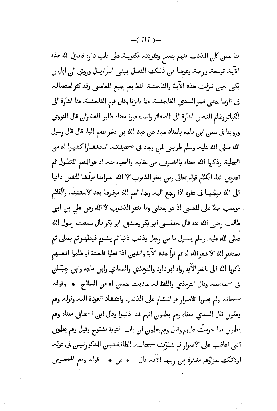 منا حين كان المذنب منهم يصبح وعقوبته مكتوبة على باب داره فأنزل الله هذه الآية توسعة ورحمة وعوضا من ذلك الفعل ببني إسرائيل وروي أن إبليس بكى حين نزلت هذه الآية والفاحشة لفظ يعم جميع المعاصي وقد كثر إستعماله في الزنا حتى فسر السدي الفاحشة هنا بالزنا وقال قوم الفاحشة هنا إشارة إلى الكبائر وظلم النفس إشارة إلى الصغائر واستغفروا معناه طلبوا الغفران قال النووي وروينا في سنن ابن ماجه بإسناد جيد عن عبد الله بن بسر بضم الباء قال قال رسول الله صلى الله عليه و سلم طوبى لمن وجد في صحيفته اسغفارا كثيرا اه من الحلية وذكروا الله معناه بالخوف من عقابه والحياء منه إذ هو المنعم المتطول ثم اعترض اثناء الكلام قوله تعالى ومن يغفر الذنوب إلا الله اعتراضا موقفا للنفس داعيا إلى الله مرجيا في عفوه إذا رجع إليه وجاء اسم الله مرفوعا بعد الإستثناء والكلام موجب حملا على المعنى إذ هو بمعنى وما يغفر الذنوب إلا الله وعن علي بن أبي طالب رضي الله عنه قال حدثني أبو بكر وصدق أبو بكر قال سمعت رسول الله صلى الله عليه و سلم يقول ما من رجل يذنب ذنبا ثم يقوم فيتطهر ثم يصلي ثم يستغفر الله إلا غفر الله له ثم قرأ هذه الآية والذين إذا فعلوا فاحشة أو ظلموا أنفسهم ذكروا الله إلى آخر الآية رواه أبو داود والترمذي والنساءي وابن ماجه وابن حبان في صحيحه وقال الترمذي واللفظ له حديث حسن اه من السلاح وقوله سبحانه ولم يصروا الإصرار هو المقام على الذنب واعتقاد العودة إليه وقوله وهم يعلمون قال السدي معناه وهم يعلمون أنهم قد اذنبوا وقال ابن إسحاق معناه وهم يعلمون بما حرمت عليهم وقيل وهم يعلمون أن باب التوبة مفتوح وقيل وهم يعلمون أنى اعاقب على الإصرار ثم شرك سبحانه الطائفتين المذكورتين في قوله أولئك جزاؤهم مغفرة من ربهم الآية قال ص قوله ونعم المخصوص