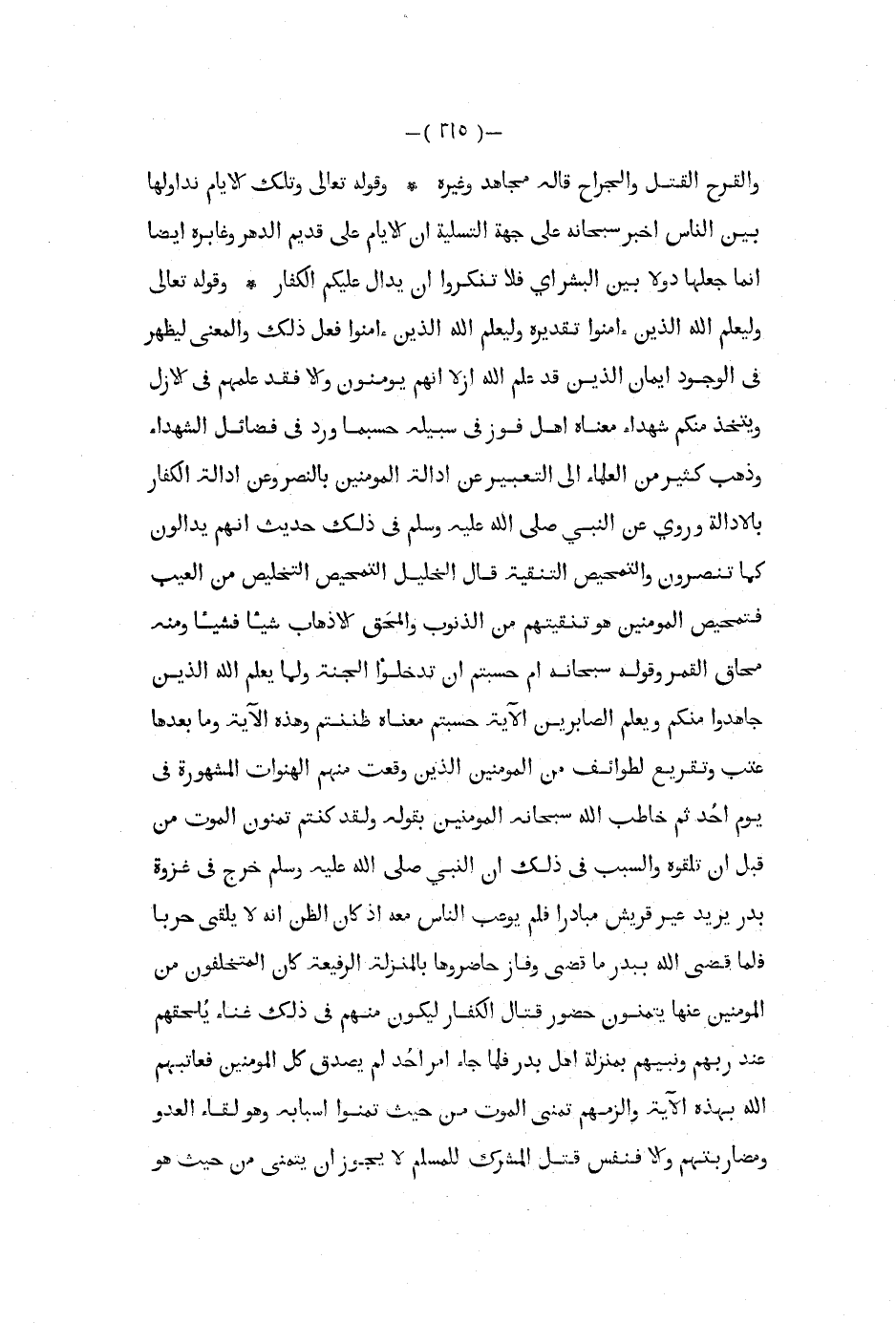 والقرح القتل والجراح قاله مجاهد وغيره وقوله تعالى وتلك الأيام نداولها بين الناس أخبر سبحانه على جهة التسليه أن الأيام على قديم الدهر وغابره أيضا إنما جعلها دولا بين البشر أي فلا تنكروا أن يدال عليكم الكفار وقوله تعالى وليعلم الله الذين ءامنوا تقديره وليعلم الله الذين ءامنوا فعل ذلك والمعنى ليظهر في الوجود إيمان الذين قد علم الله ازلا أنهم يؤمنون وإلا فقد علمهم في الأزل ويتخذ منكم شهداء معناه أهل فوز في سبيله حسبما ورد في فضائل الشهداء وذهب كثير من العلماء إلى التعبير عن أدالة المؤمنين بالنصر وعن أدالة الكفار بالأدالة وروي عن النبي صلى الله عليه و سلم في ذلك حديث أنهم يدالون كما تنصرون والتمحيص التنقية قال الخليل التمحيص التخليص من العيب فتمحيص المؤمنين هو تنقيتهم من الذنوب والمحق الأذهاب شيئا فشيئا ومنه محاق القمر وقوله سبحانه أم حسبتم أن تدخلوا الجنة ولما يعلم الله الذين جاهدوا منكم ويعلم الصابرين الآية حسبتم معناه ظننتم وهذه الآية وما بعدها عتب وتقريع لطوائف من المؤمنين الذين وقعت منهم الهنوات المشهورة في يوم أحد ثم خاطب الله سبحانه المؤمنين بقوله ولقد كنتم تمنون الموت من قبل أن تلقوه والسبب في ذلك أن النبي صلى الله عليه و سلم خرج في غزوة بدر يريد عير قريش مبادرا فلم يوعب الناس معه إذ كان الظن أنه لا يلقى حربا فلما قضى الله ببدر ما قضى وفاز حاضروها بالمنزلة الرفيعة كان المتخلفون من المؤمنين عنها يتمنون حضور قتال الكفار ليكون منهم في ذلك غناء يلحقهم عند ربهم ونبيهم بمنزلة أهل بدر فلما جاء أمر أحد لم يصدق كل المؤمنين فعاتبهم الله بهذه الآية والزمهم تمنى الموت من حيث تمنوا أسبابه وهو لقاء العدو مضاربتهم وإلا فنفس قتل المشرك للمسلم لا يجوز أن يتمنى من حيث هو