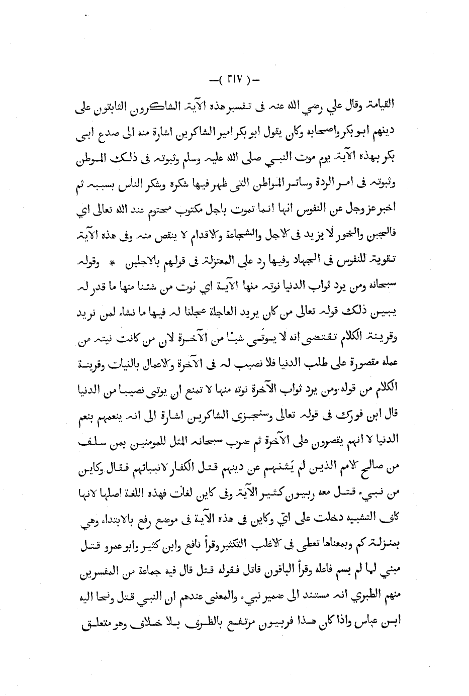القيامة وقال علي رضي الله عنه في تفسير هذه الاية الشاكرون الثابتون على دينهم أبو بكر وأصحابه وكان يقول أبو بكر أمير الشاكرين إشارة منه إلى صدع أبي بكر بهذه الآية يوم موت النبي صلى الله عليه و سلم وثبوته في ذلك الموطن وثبوته في أمر الردة وسائر المواطن الني ظهر فيها شكره وشكر الناس بسببه ثم اخبر عز و جل عن النفوس أنها إنما تموت بأجل مكتوب محتوم عند الله تعالى أي فالجبن والخور لا يزيد في الأجل والشجاعة والإقدام لا ينقص منه وفي هذه الآية تقوية للنفوس في الجهاد وفيها رد على المعتزلة في قولهم بالآجلين وقوله سبحانه ومن يرد ثواب الدنيا نؤته منها الآية أي نؤت من شئنا منها ما قدر له يبين ذلك قوله تعالى من كان يريد العاجلة عجلنا له فيها ما نشاء لمن نريد وقرينة الكلام تقتضي أنه لا يؤتى شيئا من الآخرة لأن من كانت نيته من عمله مقصورة على طلب الدنيا فلا نصيب له في الآخرة والأعمال بالنيات وقرينة الكلام من قوله ومن يرد ثواب الآخرة ونؤته منها لا تمنع أن يؤتى نصيبا من الدنيا قال ابن فورك في قوله تعالى وسنجزي الشاكرين إشارة إلى أنه ينعمهم بنعم الدنيا لا إنهم يقصرون على الآخرة ثم ضرب سبحانه المثل للمؤمنين بمن سلف من صالح الأمم الذين لم يثنهم عن دينهم قتل الكفار لأنبيائهم فقال وكاين من نبيء قتل معه ربيون كثير الآية وفي كأين لغات فهذه اللغة أصلها لأنها كاف التشبيه دخلت على أي وكأين في هذه الآية في موضع رفع بالابتداء وهي بمنزلة كم وبمعناها تعطي في الاغلب التكثير وقرأ نافع وابن كثير وأبو عمرو قتل مبني لما لم يسم فاعله وقرأ الباقون قاتل فقوله قتل قال فيه جماعة من المفسرين منهم الطبري أنه مستند إلى ضمير نبيء والمعنى عدهم أن النبي قتل ونحا إليه ابن عباس وإذا كان هذا فربيون مرتفع بالظرف بلا خلاف وهو متعلق
