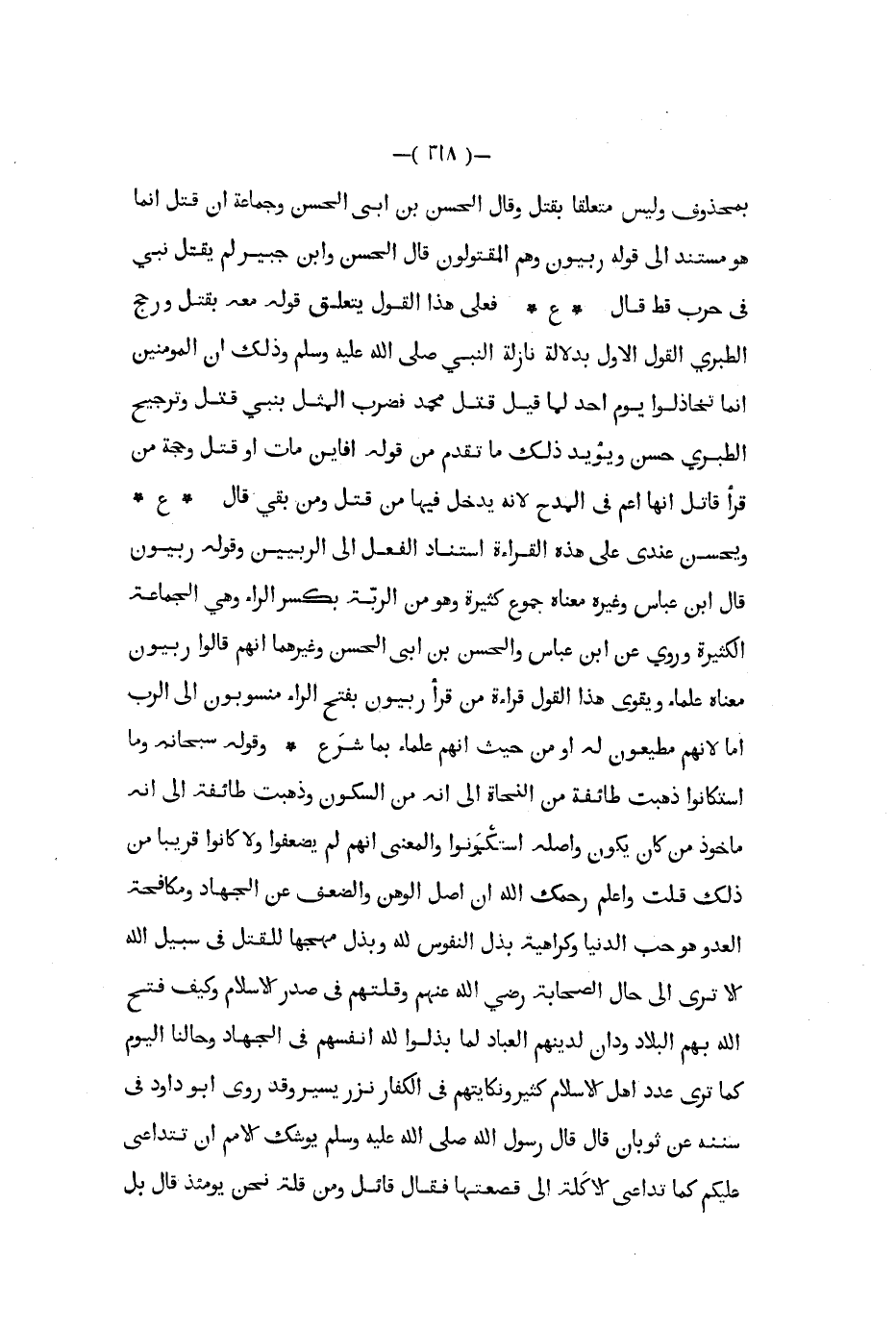 بمحذوف وليس متعلقا بقتل وقال الحسن بن أبي الحسن وجماعة أن قتل إنما هو مستند إلى قوله ربيون وهم المقتولون قال الحسن وابن جبير لم يقتل نبي في حرب قط قال ع فعلى هذا القول يتعلق قوله معه بقتل ورحج الطبري القول الأول بدلالة نازلة النبي صلى الله عليه و سلم وذلك أن المؤمنين إنما تخاذلوا يوم أحد لما قيل قتل محمد فضرب المثل بنبي قتل وترجيح الطبري حسن ويؤيد ذلك ما تقدم من قوله افأين مات أو قتل وحجة من قرأ قاتل أنها أعم في المدح لأنه يدخل فيها من قتل ومن بقي قال ع ويحسن عندي على هذه القراءة استناد الفعل إلى الربيين وقوله ربيون قال ابن عباس وغيره معناه جموع كثيرة وهو من الربة بكسر الراء وهي الجماعة الكثيرة وروي عن ابن عباس والحسن بن أبي المسن وغيرهما أنهم قالوا ربيون معناه علماء ويقوى هذا القول قراءة من قرأ ربيون بفتح الراء منسوبون إلى الرب أما لأنهم مطيعون له أو من حيث أنهم علماء بما شرع وقوله سبحانه وما استكانوا ذهبت طائفة من النحاة إلى أنه من السكون وذهبت طائفة إلى أنه مأخوذ من كان يكون واصلة استكونوا والمعنى أنهم لم يضعفوا ولا كانوا قريبا من ذلك قلت وأعلم رحمك الله أن أصل الوهن والضعف عن الجهاد ومكافحة العدو هو حب الدنيا وكراهية بذل النفوس لله وبذل مهجها للقتل في سبيل الله إلا ترى إلى حال الصحابة رضي الله عنهم وقلتهم في صدر الإسلام وكيف فتح الله بهم البلاد ودان لدينهم العباد لما بذلو لله أنفسهم في الجهاد وحالنا اليوم كما ترى عدد أهل الإسلام كثير ونكايتهم في الكفار نزر يسير وقد روى أبو داود في سننه عن ثوبان قال قال رسول الله صلى الله عليه و سلم يوشك الأمم أن تتداعى عليكم كما تداعى الأكلة إلى قصعتها فقال قائل ومن قلة نحن يومئذ قال بل