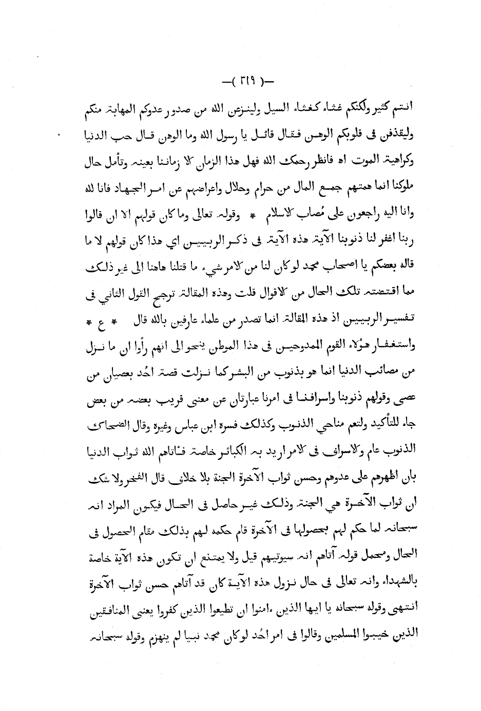 أنتم كثير ولكنكم غثاء كغثاء السيل ولينزعن الله من صدور عدوكم المهابة منكم وليقذفن في قلوبكم الوهن فقال قائل يا رسول الله وما الوهن قال حب الدنيا وكراهية الموت ا ه فانظر رحمك الله فهل هذا الزمان إلا زماننا بعينه وتأمل حال ملوكنا إنما همتهم جمع المال من حرام وحلال واعراضهم عن أمر الجهاد فإنا لله وإنا اليه راجعون على مصاب الإسلام قوله تعالى وما كان قولهم إلا أن قالوا ربنا أغفر لنا ذنوبنا الآية هذه الآية في ذكر الربيين أي هذا كان قولهم لا ما قاله بعضكم يا أصحاب محمد لو كان لنا من الأمر شيء ما قتلنا ها هنا إلى غير ذلك مما اقتضته تلك الحال من الأقوال قلت وهذه المقالة ترجح القول الثاني في تفسير الربيين إذ هذه المقالة إنما تصدر من علماء عارفين بالله قال ع واستغفار هؤلاء القوم الممدوحين في هذا الموطن ينحو إلى أنهم رأوا أن ما نزل من مصائب الدنيا إنما هو بذنوب من البشر كما نزلت قصة أحد بعصيان من عصى وقولهم ذنوبنا وأسرافنا في أمرنا عبارتان عن معنى قريب بعضه من بعض جاء للتأكيد ولتعم مناحي الذنوب وكذلك فسره ابن عباس وغيره وقال الضحاك الذنوب عام والإسراف في الأمر اريد به الكبائر خاصة فأتاهم الله ثواب الدنيا بأن اظهرهم على عدوهم وحسن ثواب الآخرة الجنة بلا خلاف قال الفخر ولاشك أن ثواب الآخرة هي الجنة وذلك غير حاصل في الحال فيكون المراد أنه سبحانه لما حكم لهم بحصولها في الآخرة قام حكمه لهم بذلك مقام الحصول في الحال ومحمل قوله آتاهم أنه سيؤتيهم قيل ولا يمتنع أن تكون هذه الآية خاصة بالشهداء وأنه تعالى في حال نزول هذه الآية كان قد آتاهم حسن ثواب الآخرة انتهى وقوله سبحانه يا أيها الذين آمنوا إن تطيعوا الذين كفروا يعني المنافقين الذين خيبوا المسلمين وقالوا في أمر أحد لو كان محمد نبيا لم ينهزم وقوله سبحانه