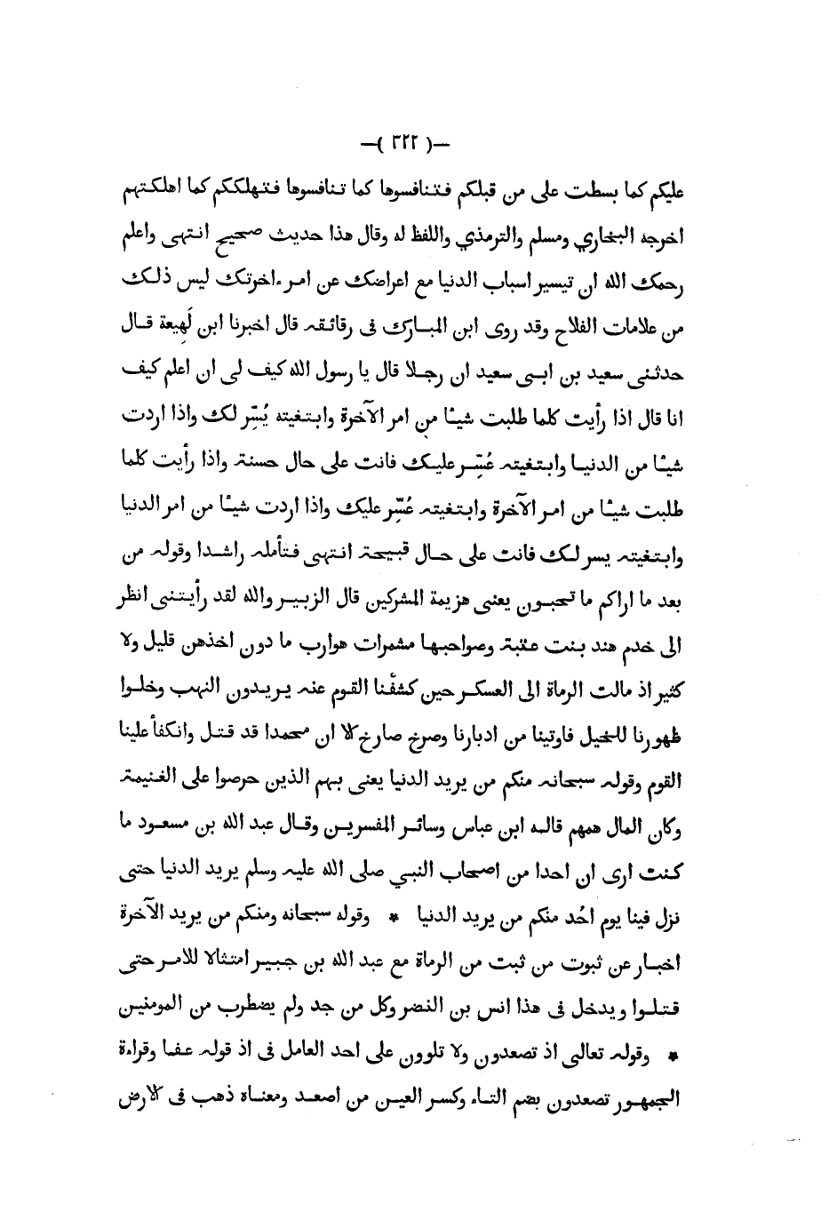 عليكم كما بسطت على من قبلكم فتنافسوها كما تنافسوها فتهلككم كما اهلكتهم أخرجه البخاري ومسلم والترمذي واللفظ له وقال هذا حديث صحيح أنتهى وأعلم رحمك الله أن تيسير أسباب الدنيا مع اعراضك عن أمر أخرتك ليس ذلك من علامات الفلاح وقد روى ابن المبارك في رقائقه قال أخبرنا ابن لهيعة قال حدثني سعيد بن أبي سعيد أن رجلا قال يا رسول الله كيف لي أن أعلم كيف أنا قال إذا رأيت كلما طلبت شيئا من أمر الآخرة وابتغيته يسر لك وإذا أردت شيئا من الدنيا وابتغيته عسر عليك فانت على حال حسنة وإذا رأيت كلما طلبت شيئا من أمر الآخرة وابتغيته عسر عليك وإذا أردت شيئا من أمر الدنيا وابتغيته يسر لك فانت على حال قبيحة انتهى فتأمله راشدا وقوله من بعد ما اراكم ما تحبون يعني هزيمة المشركين قال الزبير والله لقد رأيتنى انظر إلى خدم هند بنت عتبة وصواحبها مشمرات هوارب ما دون أخذهن قليل ولا كثير إذ مالت الرماة إلى العسكر حين كشفنا القوم عنه يريدون النهب وخلوا ظهورنا للخيل فاوتينا من ادبارنا وصرخ صارخ إلا أن محمدا قد قتل وانكفأ علينا القوم وقوله سبحانه منكم من يريد الدنيا يعنى بهم الذين حرصوا على الغنيمة وكان المال همهم قاله ابن عباس وسائر المفسرين وقال عبد الله بن مسعود ما كنت أرى أن أحدا من أصحاب النبي صلى الله عليه و سلم يريد الدنيا حتى نزل فينا يوم أحد منكم من يريد الدنيا وقوله سبحانه ومنكم من يريد الآخرة أخبار عن ثبوت من ثبت من الرماة مع عبد الله بن جبير امتثالا للامر حتى قتلوا ويدخل في هذا أنس بن النضر وكل من جد ولم يضطرب من المؤمنين وقوله تعالى إذ تصعدون ولا تلوون على احد العامل في إذ قوله عفا وقراءة الجمهور تصعدون بضم التاء وسر العين من اصعد ومعناه ذهب في الأرض