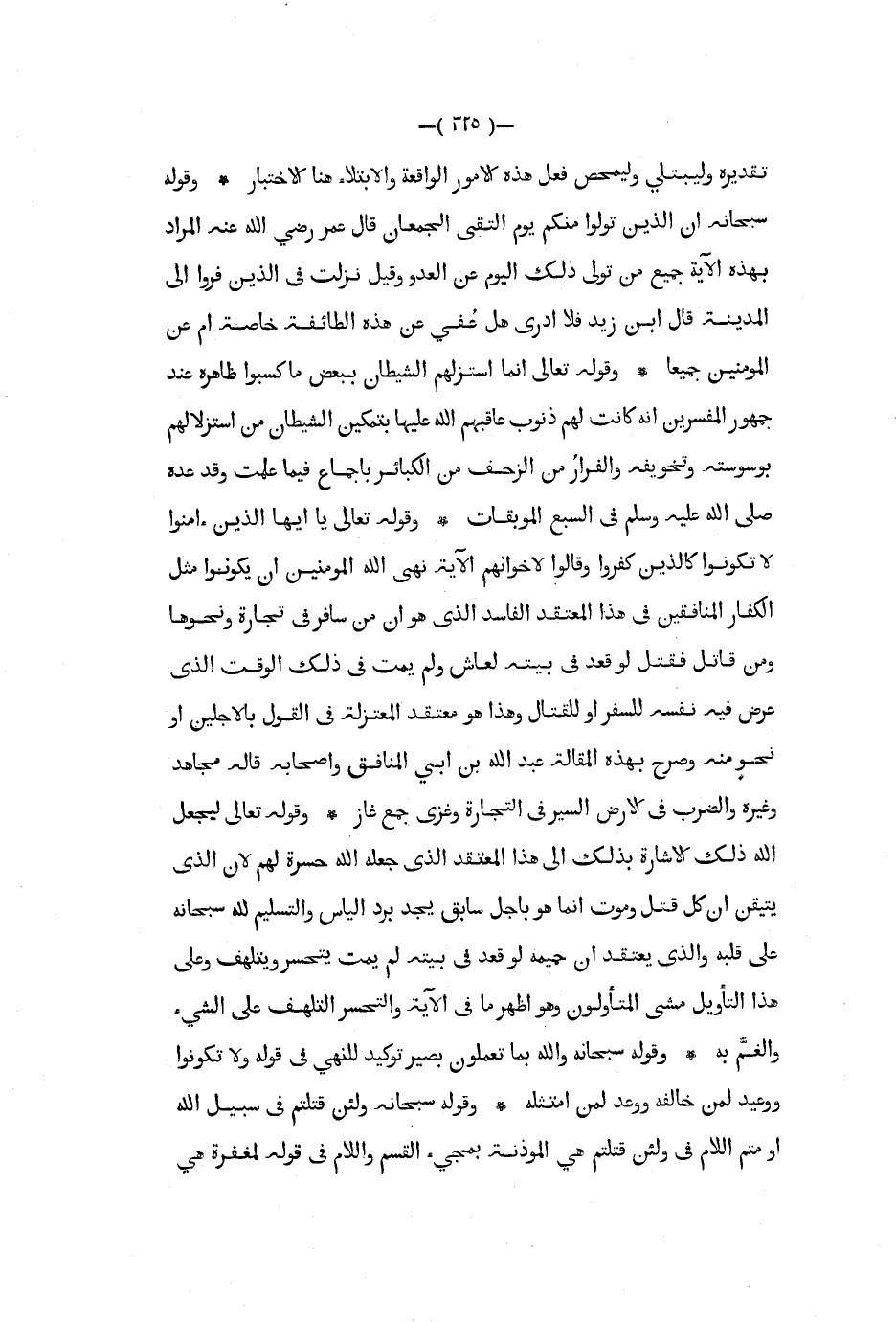 تقديره وليبتلي وليمحص فعل هذه الأمور الواقعة والابتلاء هنا الأختبار وقوله سبحانه أن الذين تولوا منكم يوم التقى الجمعان قال عمر رضي الله عنه المراد بهذه الآية جميع من تولى ذلك اليوم عنالعدو وقيل نزلت في الذين فروا إلى المدينة قال ابن زيد فلا ادرى هل عفي عن هذه الطائفة خاصة أم عن المؤمنين جميعا وقوله تعال إنما استزلهم الشيطان ببعض ما كسبوا ظاهره عند جمهور المفسرين أنه كانت لهم ذنوب عاقبهم الله عليها بتمكين الشيطان من استزلالهم بوسوسته وتخويفه والفرار من الزحف من الكبار باجماع فيما علمت وقد عده صلى الله عليه و سلم في السبع الموبقات وقوله تعالى يا أيها الذين أمنوا لا تكونوا كالذين كفروا وقالوا لا خوانهم الآية نهى الله المؤمنين أن يكونوا مثل الكفار المنافقين في هذا المعتقد الفاسد الذي هو أن من سافر في تجارة ونحوها ومن قاتل فقتل لو قعد في بيته لعاش ولم يمت في ذلك الوقت الذي عرض فيه نفسه للسفر أو للقتل وهذا هو معتقد المعتزلة في القول بالاجلين أو نحو منه وصرح بهذه المقالة عبد الله بن أبي المنافق وأصحابه قاله مجاهد وغيره والضرب في الأرض السير في التجارة وغزى جمع غاز وقوله تعالى ليجعل الله ذلك الإشارة بذلك إلى هذا المعتقد الذي جعله الله حسرة لهم لأن الذي يتيقن أن كل قتل وموت إنما هو باجل سابق يجد برد الياس والتسليم لله سبحانه على قلبه والذي يعتقد أن جميمه لو قعد في بيته لم يمت يتحسر ويتلهف وعلى هذا التأويل مشى المتأولون وهو اظهر ما في الآية والتحسر التلهف على الشيء والغم به وقوله سبحانه والله بما تعملون بصير توكيد للنهي في قوله ولا تكونوا ووعيد لمن خالفه ووعد لمن امتثله وقوله سبحانه ولئن قتلتم في سبيل الله أو متم اللام في ولئن قتلتم هي المؤذنة بمجيء القسم واللام في قوله لمغفرة هي
