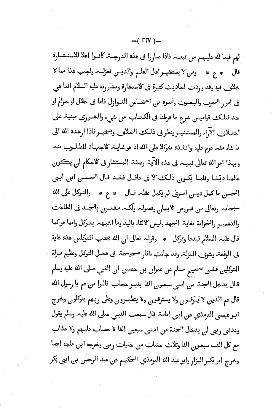 لهم فيما لله عليهم من تبعة فإذا صاروا في هذه الدرجة كانوا اهلا لللاستشارة قال ع ومن لا يستشير أهل العلم والدين فعزله واجب هذا مما لا خلاف فيه وقد وردت احاديث كثيرة في الاستشارة ومشاورته عليه السلام إنما هي في أمور الحرب والبعوث ونحوه من اشخاص النوازل فأما في حلال أو حرام أو حد فتلك قوانين شرع ما فرطنا في الكتاب من شيء والشورى مبنية على اختلاف الآراء والمستشير ينظر في ذلك الخلاف ويتخير فاذا ارشده الله إلى ما شاء منه عزم عليه وانفذه متوكلا على الله إذ هو غاية الاجتهاد المطلوب منه وبهذا أمر الله تعالى نبيه في هذه الآية وصفة المستشار في الآحكام أن يكون عالما دينا وقلما يكون ذلك إلا في عاقل فقد قال الحسن ابن أبي الحسن ما كمل دين امرىء لم يكمل عقله قال ع والتوكل على الله سبحانه وتعالى من فروض الإيمان وفصوله ولكنه مقترن بالجد في الطاعات والتشمير والحزامة بغاية الجهد وليس الالقاء باليد وما اشبهه بتوكل وإنما هو كما قال عليه السلام قيدها وتوكل وقوله تعالى أن الله يحب المتوكلين هذه غاية في الرفعة وشرف المنزلة وقد جاءت أثار صحيحة في فضل التوكل وعظيم منزلة المتوكلين ففي صحيح مسلم عن عمران بن حصين أن النبي صلى الله عليه و سلم قال يدخل الجنة من امتى سبعون الفا بغير حساب قالوا من هم يا رسول الله قال هم الذين لا يرقون ولا يسترقون ولا يتطيرون وعلى ربهم يتوكلون وخرج أبو عيسى الترمذي عن أبي أمامة قال سمعت النبي صلى الله عليه و سلم يقول وعدني ربي أن يدخل الجنة من أمتى سبعين الفا لا حساب عليهم ولا عذاب مع كل الف سبعون الفا وثلاث حثيات من حثيات ربي وخرجه ابن ماجه أيضا وخرج أبو بكر البزار وأبو عبد الله الترمذي الحكيم عن عبد الرحمن بن أبي بكر