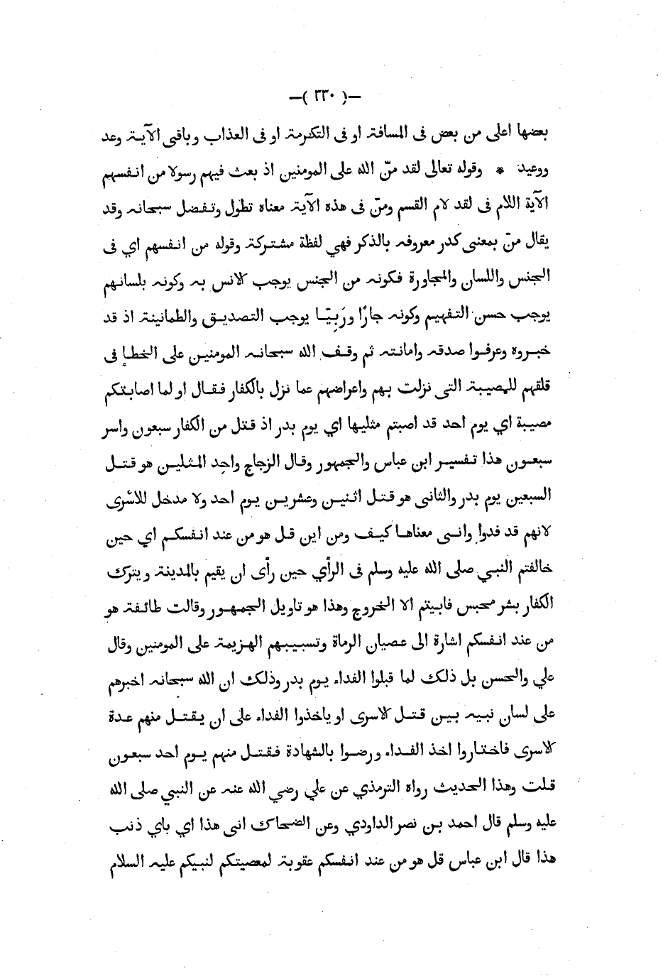 بعضها اعلى من بعض في المسافة او في التكرمة او في العذاب وباقي الآية وعد ووعيد وقوله تعالى لقد من الله على المؤمنين إذ بعث فيهم رسولا من أنفسهم الآية اللام في لقد لام القسم ومن في هذه الآية معناه تطول وتفضل سبحانه وقد يقال من بمعنى كدر معروفه بالذكر فهي لفظة مشتركة وقوله من أنفسهم أي في الجنس والسان والمجاورة فكونه من الجنس يوجب الأنس به وكونه بلسانهم يوجب حسن التفهيم وكونه جارا وربيا يوجب التصديق والطمأنينة إذ قد خبروه وعرفوا صدقه وأمانته ثم وقف الله سبحانه المؤمنين على الخطأ في قلقهم للمصيبة التي نزلت بهم وإعراضهم عما نزل بالكفار فقال أو لما اصابتكم مصيبة أي يوم احد قد اصبتم مثليها أي يوم بدر إذ قتل من الكفار سبعون وأسر سبعون هذا تفسير ابن عباس والجمهور وقال الزجاج واحد المثلين هو قتل السبعين يوم بدر والثاني هو قتل اثنين وعشرين يوم احد ولا مدخل للإسرى لأنهم قد فدوا وانى معناها كيف ومن اين قل هو من عند انفسكم أي حين خالفتم النبي صلى الله عليه و سلم في الرأي حين رأى ان يقيم بالمدينة ويترك الكفار بشر محبس فأبيتم إلا الخروج وهذا هو تأويل الجمهور وقالت طائفة هو من عند أنفسكم إشارة إلى عصيان الرماةوتسبيبهم الهزيمة على المؤمنين وقال علي والحسن بل ذلك لما قبلوا الفداء يوم بدر وذلك أن الله سبحانه أخبرهم على لسان نبيه بين قتل الاسرى أو يأخذوا الفداء على ان يقتل منهم عدة الإسرى فاختاروا أخد الفداء ورضوا بالشهادة فقتل منهم يوم احد سبعون قلت وهذا الحديث رواه الترمذي عن علي رضي الله عنه عن النبي صلى الله عليه و سلم قال أحمد بن نصر الداودي وعن الضحاك أني هذا أي باي ذنب هذا قال ابن عباس قل هو من عند أنفسكم عقوبة لمعصيتكم لنبيكم عليه السلام اه