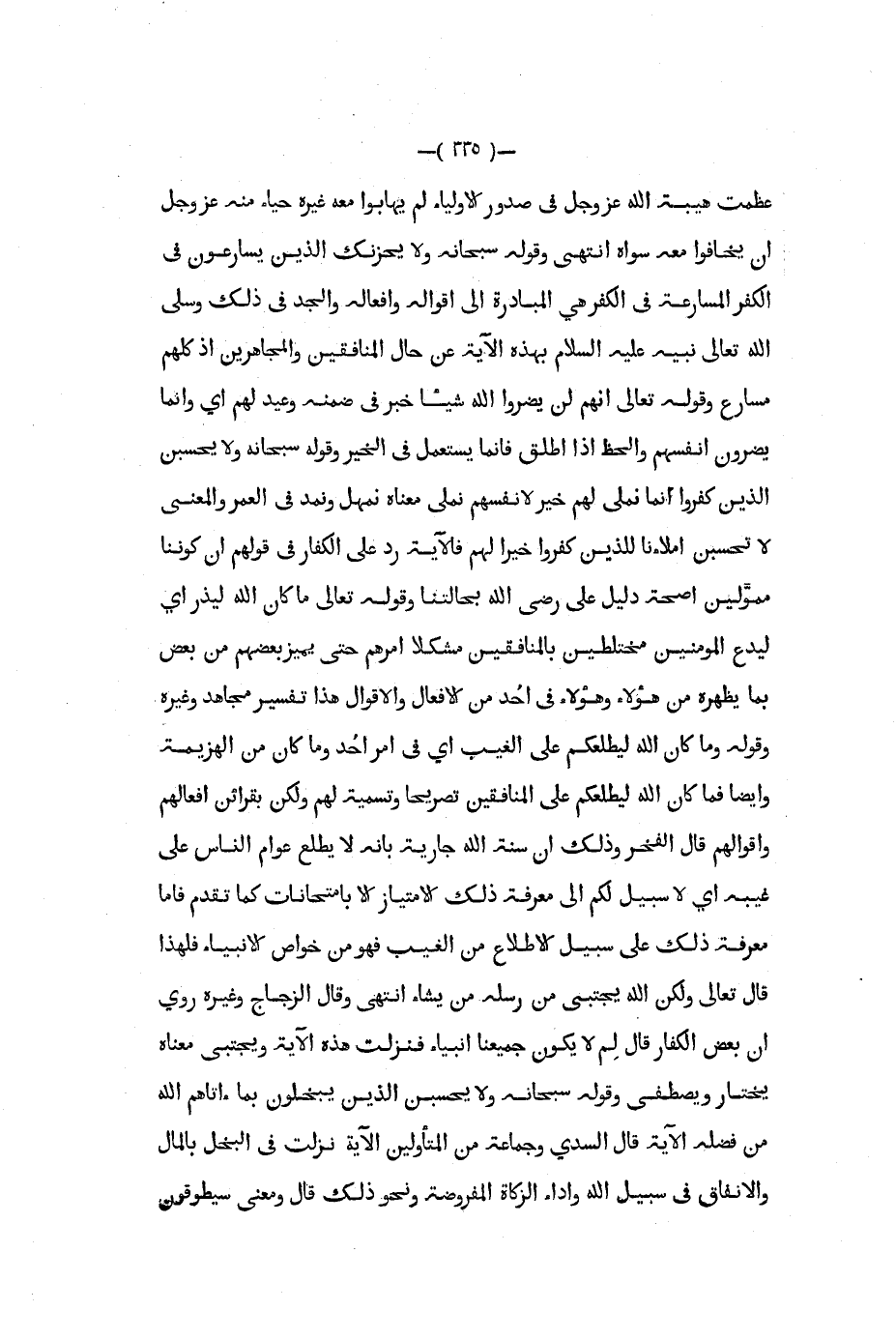 عظمت هيبة الله عز و جل في صدقور الأولياء لم يهابوا معه غيره حياء منه عز و جل أن يخافوا معه سواه انتهى وقوله سبحانه ولا يحزنك الذين يسارعون في الكفر المسارعة في الكفر هي المباردة إلى أقواله وأفعاله والجد في ذلك وسلى الله تعالى نبيه عليه السلام بهذه الآية عن حال المنافقين والمجاهرين إذ كلهم مسارع وقوله تعالى انهم لن يضروا الله شيئا خبر في ضمنه وعيد لهم أي وإنما يضرون أنفسهم والحظ إذا أطلق فإنما يستعمل في الخير وقوله سبحانه ولا يحسبن الذين كفروا إنما نملي لهم خيرا لأنفسهم نملي معناه نمهل ونمد في العمر والمعنى لا تحسبن أملاءنا للذين كفروا خيرا لهم فالآية رد على الكفار في قولهم إن كوننا ممولين أصحة دليل على رضى الله بحالتنا وقوله تعالى ما كان الله ليذر أي ليدع المؤمنين مختلطين بالمنافقين مشكلا أمرهم حتىيميز بعضهم من بعض بما يظهره من هؤلاء وهؤلاء في أحد من الأفعال والأقوال هذا تفسر مجاهد وغيره وقوله وما كان الله ليطلعكم على الغيب أي في أمر أحد وما كان من الهزيمة وأيضا فما كان الله ليطلعكم على المنافقين تصريحا وتسمية لهم ولكن بقرائن أفعالهم وأقوالهم قال الفخر وذلك أن سنة الله جارية بأنه لا يطلع عوام الناس على غيبه أي لا سبيل لكم إلى معرفة ذلك الامتياز إلا بإمتحانات كما تقدم فأما معرفة ذلك على سبيل الإطلاع من الغيب فهو من خواص الأنبياء فلهذا قال تعالى ولكن الله يجتبي من رسله من يشاء انتهى وقال الزجاج وغيره روي أن بعض الكفار قال لم لا يكون جميعنا أنبياء فنزلت هذه الآية ويجتبي معناه يختار ويصطفي وقوله سبحانه ولا يحسبن الذين يبخلون بما ءاتاهم الله من فضله الآية قال السدي وجماعة من المتأولين الآية نزلت في البخل بالمال والإنفاق في سبيل الله واداء الزكاة المفروضة ونحو ذلك قال ومعنى سيطوقون