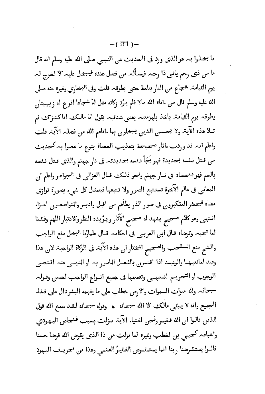 ما بخلوا به هو الذي ورد في الحديث عن النبي صلى الله عليه و سلم أنه قال ما من ذي رحم يأتي ذا رحمه فيسأله من فضل عنده فيبخل عليه إلا أخرج له يوم القيامة شجاع من النار يتلمظ حتى يطوقه قلت وفي البخاري وغيره عنه صلى الله عليه و سلم قال من آتاه الله مالا فلم يؤد زكاته مثل له شجاعا أقرع له زبيبتان يطوقه يوم القيامة يأخذ بلهزمتيه يعني شدقيه يقول أنا مالك أنا كنزك ثم تلا هذه الآية ولا يحسبن الذين يبخلون بما ءاتاهم الله من فضله الآية قلت وأعلم أنه قد وردت آثار صحيحة بتعذيب العصاة بنوع ما عصوا به كحديث من قتل نفسه بحديدة فهو يجأ نفسه بحديدته في نار جهنم والذي قتل نفسه بالسم فهو يتحساه في نار جهنم ونحو ذلك قال الغزالي في الجواهر وأعلم أن المعاني في عالم الآخرة تستتبع الصور ولا تتبعها فيتمثل كل شيء بصورة توازي معناه فيحشر المتكبرون في صور الذر يطأهم من أقبل وأدبر والمتواضعون أعزاء انتهى وهو كلام صحيح يشهد له صحيح الآثار ويؤيده النظر والإعتبار اللهم وفقنا لما تحبه وترضاه قال ابن العربي في أحكامه قال علماؤنا البخل منع الواجب والشح منع المستحب والصحيح المختار أن هذه الآية في الزكاة الواجبة لأن هذا وعيد لمانعيها والوعيد إذا اقترن بالفعل المأمور به أو المنهي عنه اقتضى الوجوب أو التحريم انتهى وتعميمها في جميع انواع الواجب أحسن وقوله سبحانه ولله ميراث السموات والأرض خطاب على ما يفهمه البشر دال على فناء الجميع وأنه لا يبقى مالك إلا الله سبحانه وقوله سبحانه لقد سمع الله قول الذين قالوا إن الله فقير ونحن أغنياء الآية نزلت بسبب فنحاص اليهودي وأشباهه كحيي بن أخطب وغيره لما نزلت من ذا الذي يقرض الله قرضا حسنا قالوا يستقرضنا ربنا إنما يستقرض الفقير الغني وهذا من تحريف اليهود
