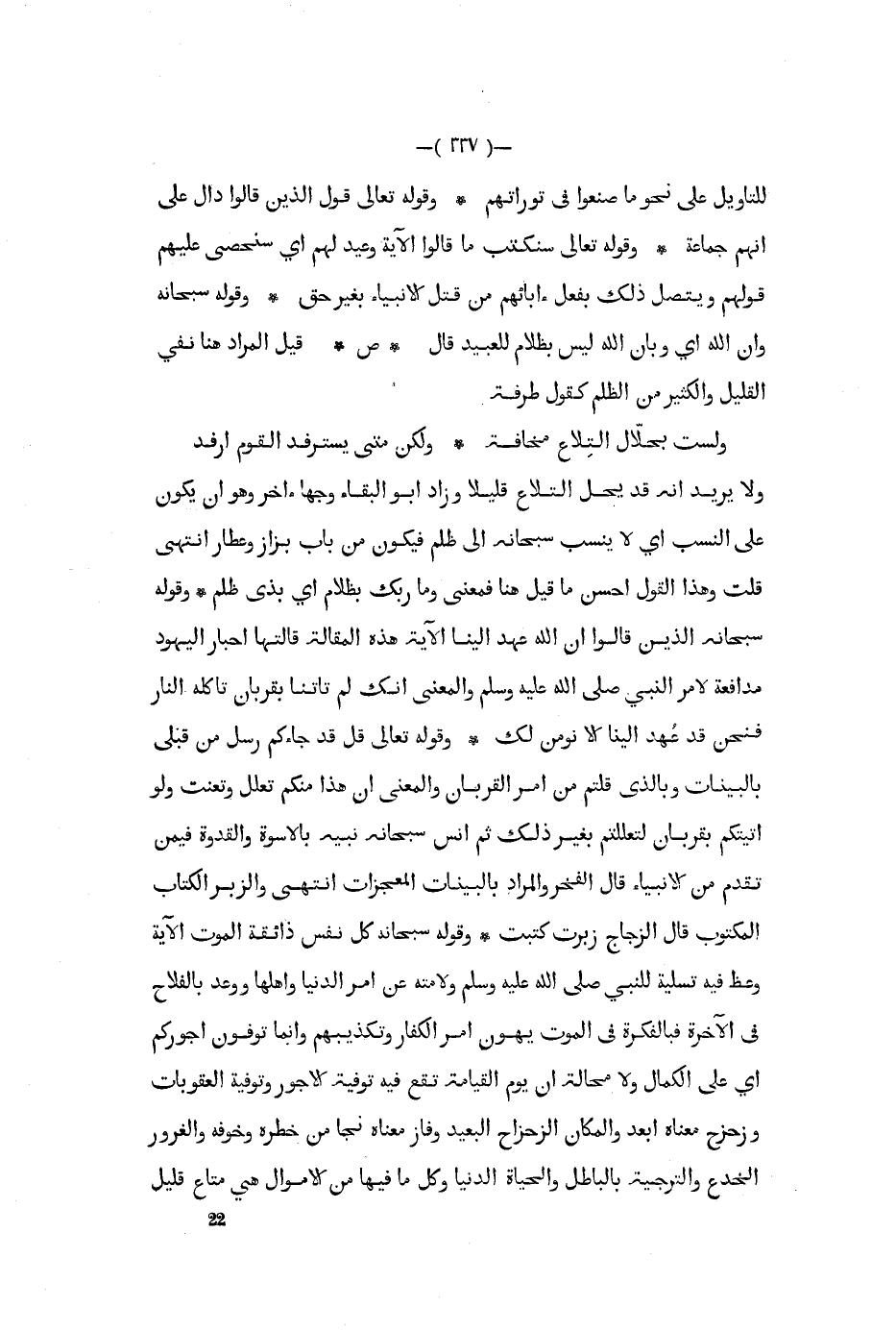 ولا يريد أنه قد يحل التلاع قليلا وزاد أبو البقاء وجها آخر وهو أن يكون علىالنسب أي لا ينسب سبحانه إلى ظلم فيكون من باب بزاز وعطار انتهى قلت وهذا القول أحسن ما قيل هنا فمعنى وما ربك بظلام أي بذي ظلم وقوله سبحانه الذين قالوا إن الله عهد إلينا الآية هذه المقالة قالتها أحبار اليهود مدافعة لأمر النبي صلى الله عليه و سلم والمعنى أنك لم تأتنا بقربان تأكله النار فنحن قد عهد إلينا ألا نؤمن لك وقوله تعالى قل قد جاءكم رسل من قبلي بالبينات وبالذي قلتم من أمر القربان والمعنى أن هذا منكم تعلل وتعنت ولو أتيتكم بقربان لتعللتم بغير ذلك ثم أنس سبحانه نبيه بالأسوة والقدره فيمن تقدم من الأنبياء قال الفخر والمراد بالبينات المعجزات انتهى والزبر الكتاب المكتوب قال الزجاج زبرت كتبت وقوله سبحانه كل نفس ذائقة الموت الآية وعظ فيه تسلية للنبي صلى الله عليه و سلم ولأمته عن أمر الدنيا وأهلها ووعد بالفلاح في الآخرة فبالفكرة في الموت يهون أمر الكفار وتكذيبهم وإنما توفون أجوركم أي على الكمال ولا محالة أن يوم القيامة تقع فيه توفية الأجور وتوفية العقوبات وزحزح معناه أبعد والمكان الزحزاح البعيد وفاز معناه نجا من خطره وخوفه والغرور الخدع والترجية بالباطل والحياة الدنيا ولك ما فيها من الأموال هي متاع قليل