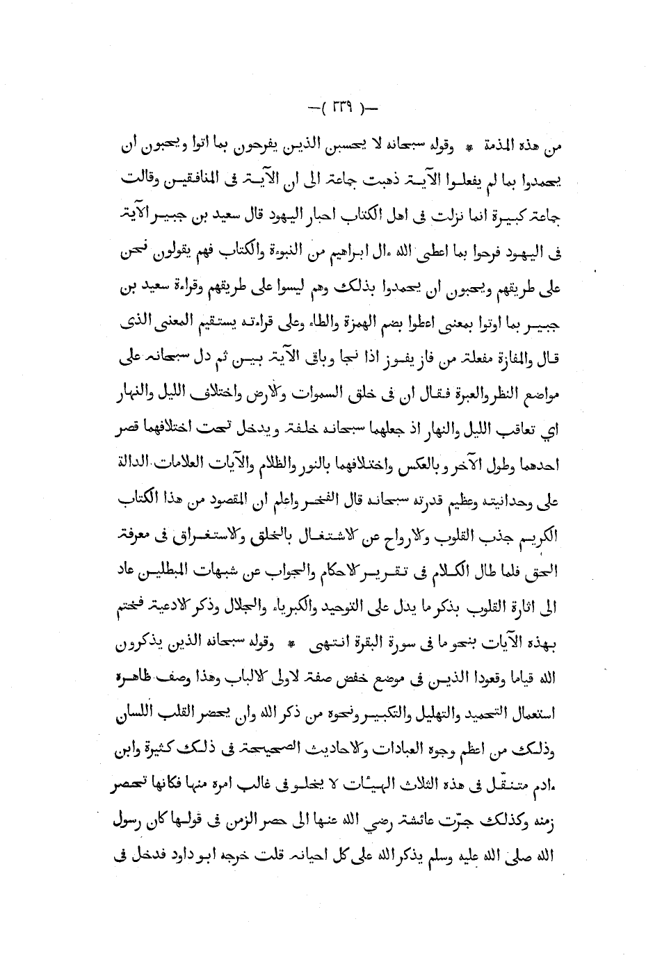 من هذه المذمة وقوله سبحانه لا يحسبن الذين يفرحون بما أتوا ويحبون أن يحمدوا بما لم يفعلوا الآية ذهب جماعة إلى أن الآية في المنافقين وقالت جماعة كبيرة إنما نزلت في أهل الكتاب أحبار اليهود قال سعيد بن جبير الآية في الهيود فرحوا بما أعطى الله آل إبراهيم من النبوءة والكتاب فهم يقولون نحن على طريقهم ويحبون أن يحمدوا بذلك وهم ليسوا على طريقهم وقراءة سعيد بن جبير بما أوتوا بمعنى أعطوا بضم الهمزة والطاء وعلى قراءته يستقيم المعنى الذي قال والمفازة مفعلة من فاز يفوز إذا نجا وباقي الآية بين ثم دل سبحانه على مواضع النظر والعبرة فقال إن في خلق السموات والأرض واختلاف الليل والنهار أي تعاقب الليل والنهار إذ جعلهما سبحانه خلفة ويدخل تحت اختلافهما قصر أحدهما وطول الآخر وبالعكس واختلافهما بالنور والظلام والآيات العلامات الدالة على وحدانيته وعظيم قدرته سبحانه قال الفخر وأعلم أن المقصود من هذا الكتاب الكريم جذب القلوب والأرواح عن الإشتغال بالخلق والإستغراق في معرفة الحق فلما طال الكلام في تقرير الأحكام والجواب عن شبهات المبطلين عاد إلى إثارة القلوب بذكر ما يدل على التوحيد والكبرياء والجلال وذكر الأدعية فختم بهذه الآيات بنحو ما فى سورة البقرة انتهى وقوله سبحانه الذين يذكرون الله قياما وقعودا الذين في موضع خفض صفة لأولى الألباب وهذا وصف ظاهره استعمال التحميد والتهليل والتكبير ونحوه من ذكر الله وأن يحضر القلب اللسان وذلك من أعظم وجوه العبادات والأحاديث الصحيحة في ذلك كثيرة وابن آدم متنقل في هذه الثلاث الهيئات لا يخلو في غالب أمره منها فكأنها تحصر زمنه وكذلك جرت عائشة رضي الله عنها إلى حصر الزمن في قولها كان رسول الله صلى الله عليه و سلم يذكر الله على كل أحيانه قلت خرجه أبو داود فدخل في