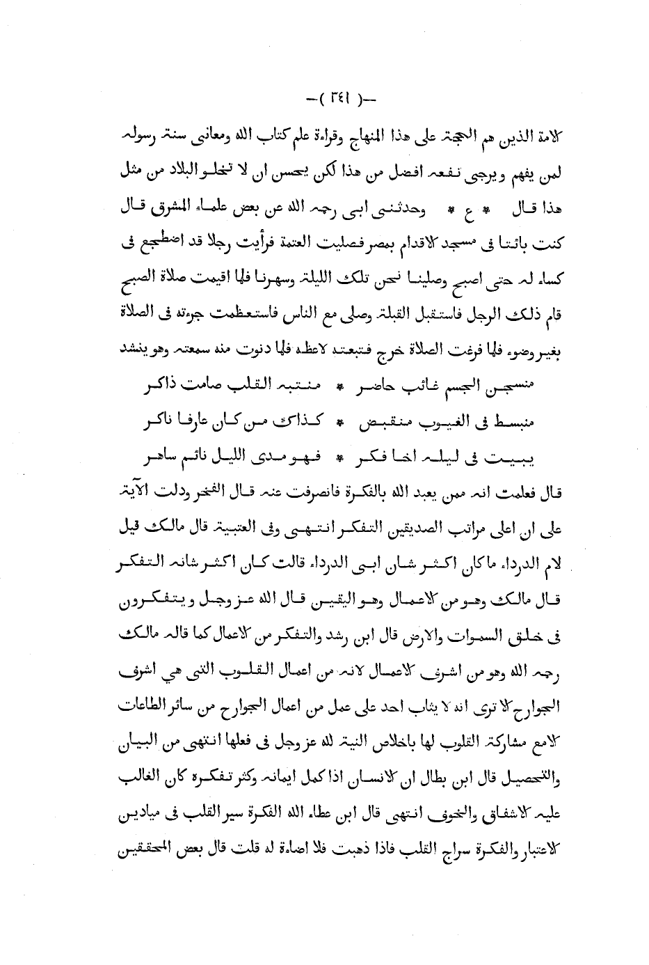 الأمة الذين هم الحجة على هذا المنهاج وقراءة علم كتاب الله ومعاني سنة رسوله لمن يفهم ويرجى نفعه أفضل من هذا لكن يحسن أن لا تخلوا البلاد من مثل هذا قال ع وحدثني أبي رحمه الله عن بعض علماء المشرق قال كنت بائتا في مسجد الأقدام بمصر فصليت العتمة فرأيت رجلا قد أضطجع في كساء له حتى أصبح وصلينا نحن تلك الليلة وسهرنا فلماأقيمت صلاة الصبح قام ذلك الرجل فاستقبل القبلة وصلى مع الناس فاستعظمت جرءته في الصلاة بغير وضوء فلما فرغت الصلاة خرج فتبعته لأعظمه فلما دنوت منه سمعته وهو ينشد ... منسجن الجسم غائب حاضر ... منتبه القلب صامت ذاكر ...